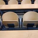 Stolice za auditorijum su naš standardni program Star, koji se već dugi niz godina pokazao kao odlično rješenje za veće i manje dvorane. Nasloni i sjedišta su od bukovog otpreska, ergonomski oblikovanog, na čvrstoj metalnoj konstrukciji antracit sive boje. Sjedišta se sutomatski preklapaju. Prvi red ima perforirani panel a sve plohe za pisanje su izvedene od bukove furnirske ploče. Ispod radnih ploča provedene su i duple utičnice za laptop i slično.