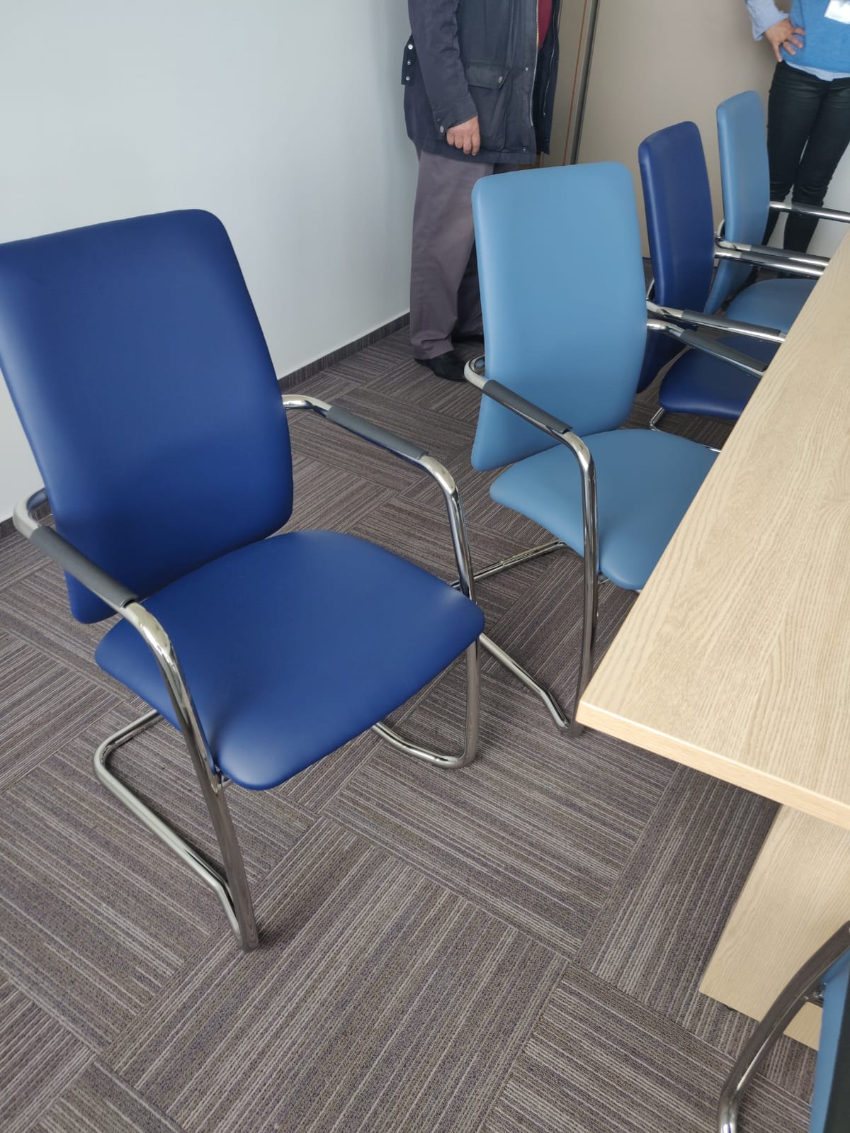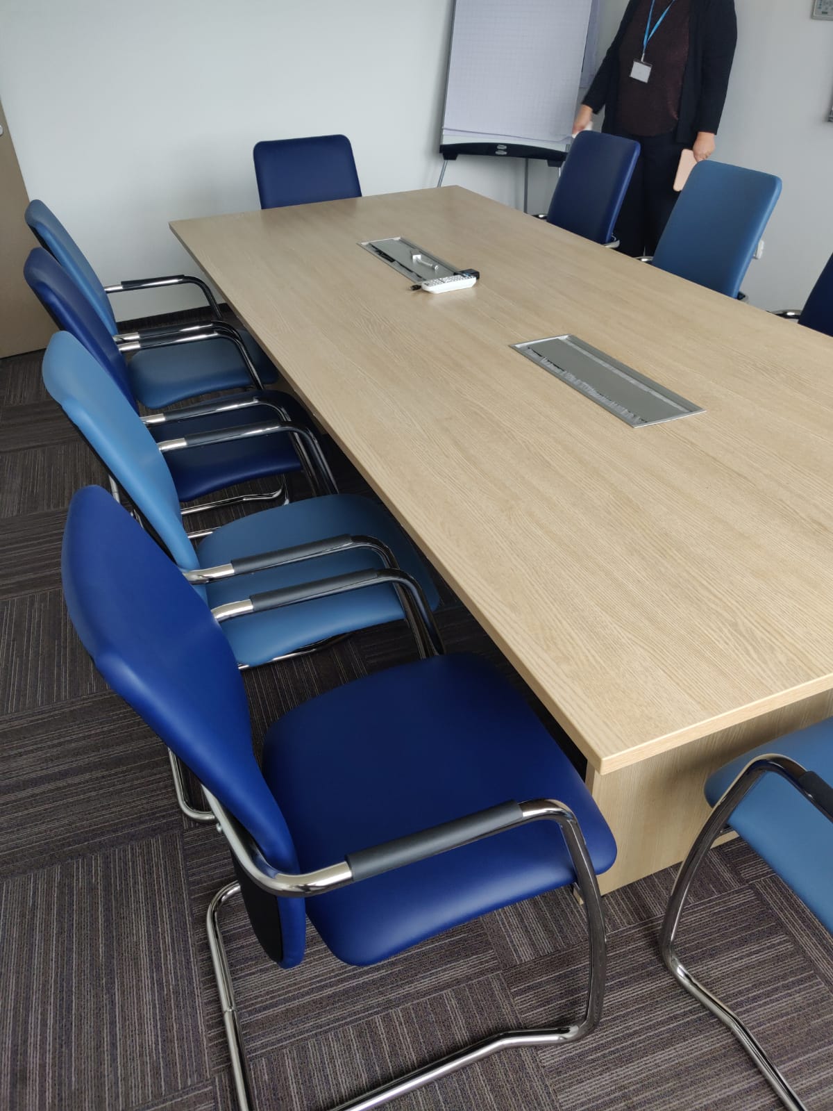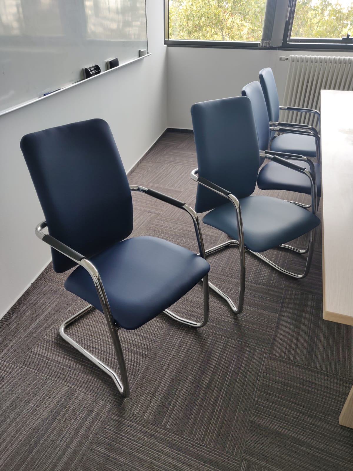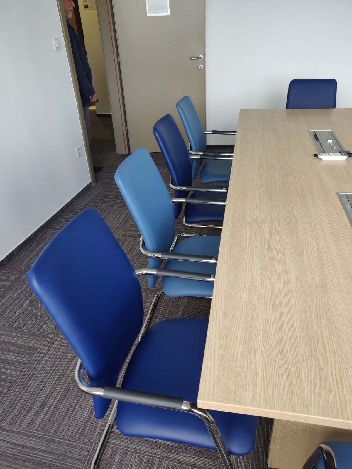In addition to the previously delivered conference table in bleached oak, we also added blue MAGIX conference chairs in two blue colors.