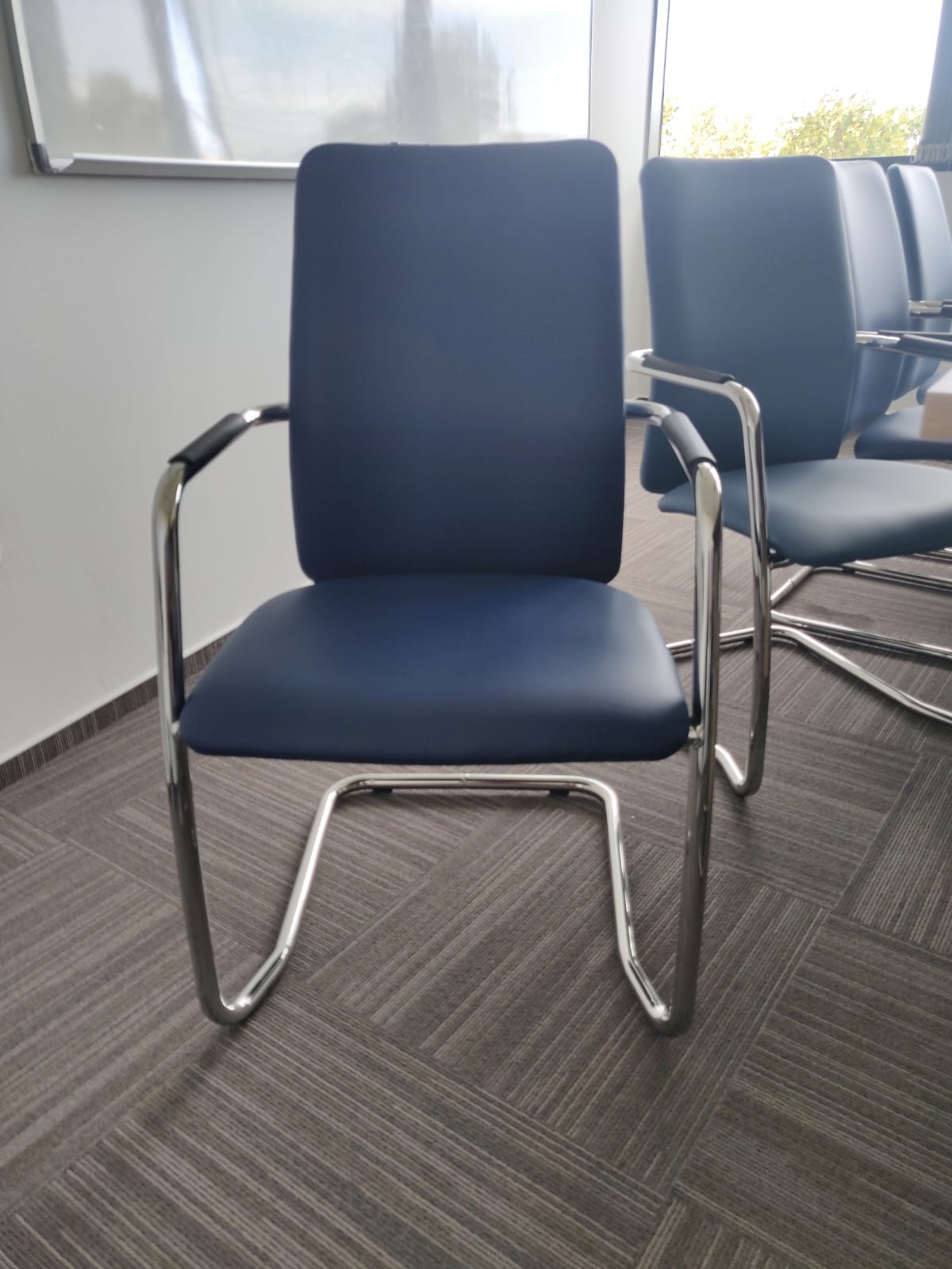 The chairs have a high back and a chrome ski base. We upholstered them in lighter and darker eco leather, in company colors.