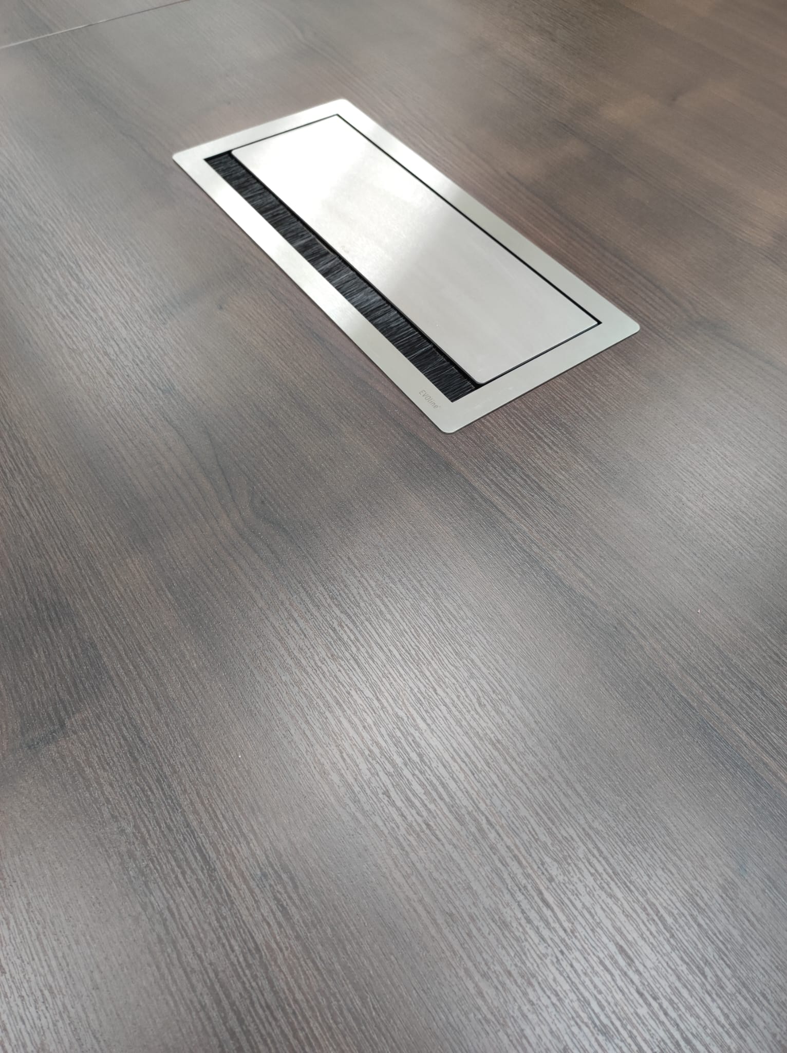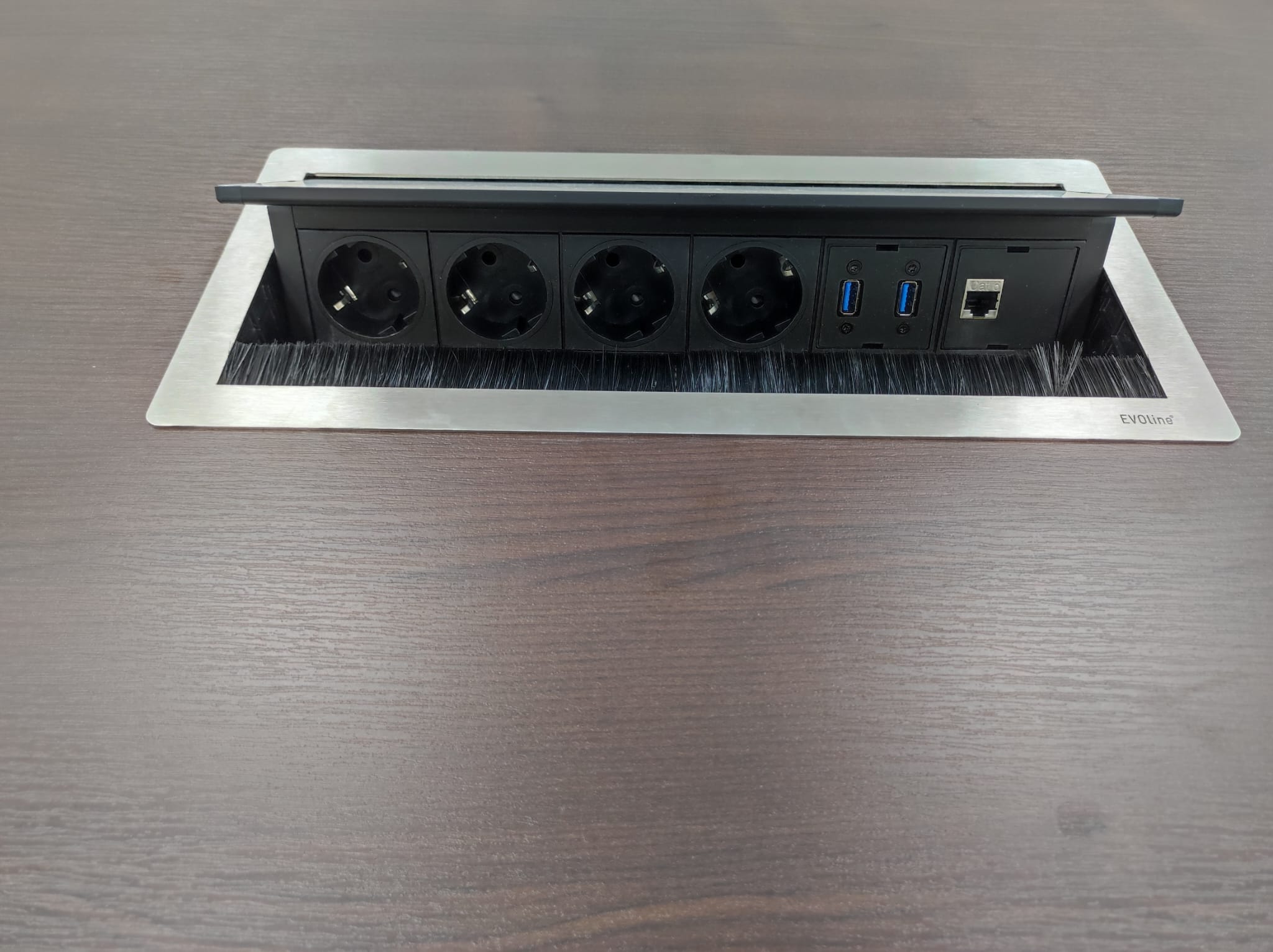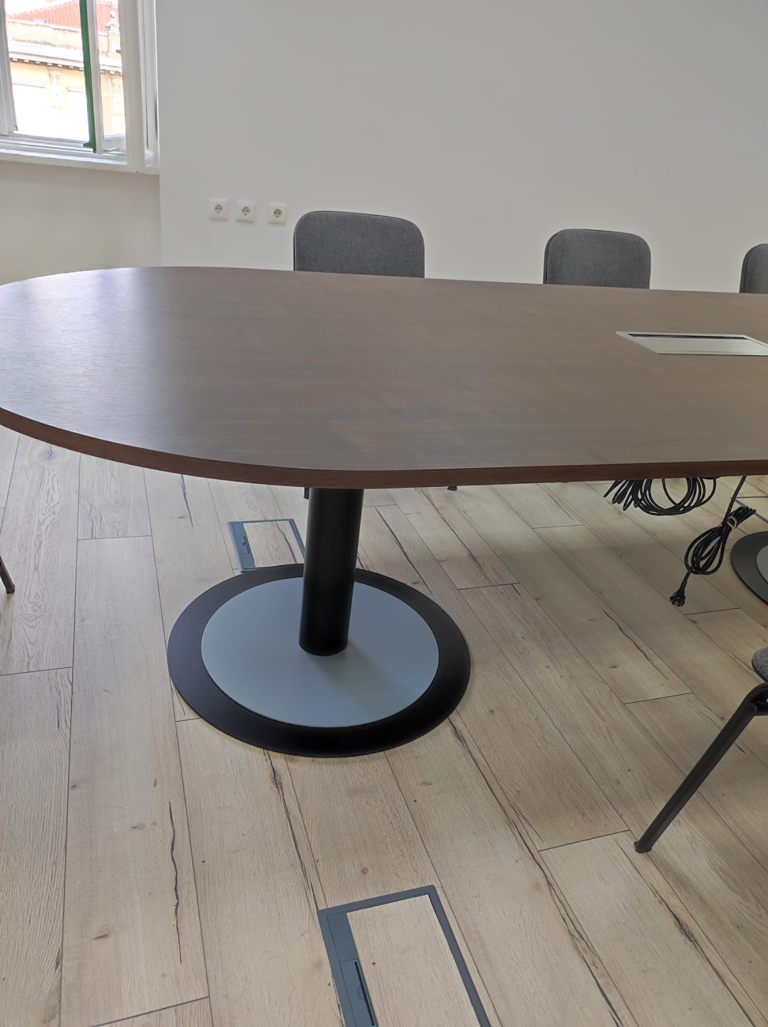 The table is additionally reinforced with a large base plate that gives it additional stability and strength, and the legs themselves are centrally placed and enable unhindered sitting around the table. Electrical connectors are assembled according to the client's request and contain several different connectors that are interconnected and ready to be installed in the table.