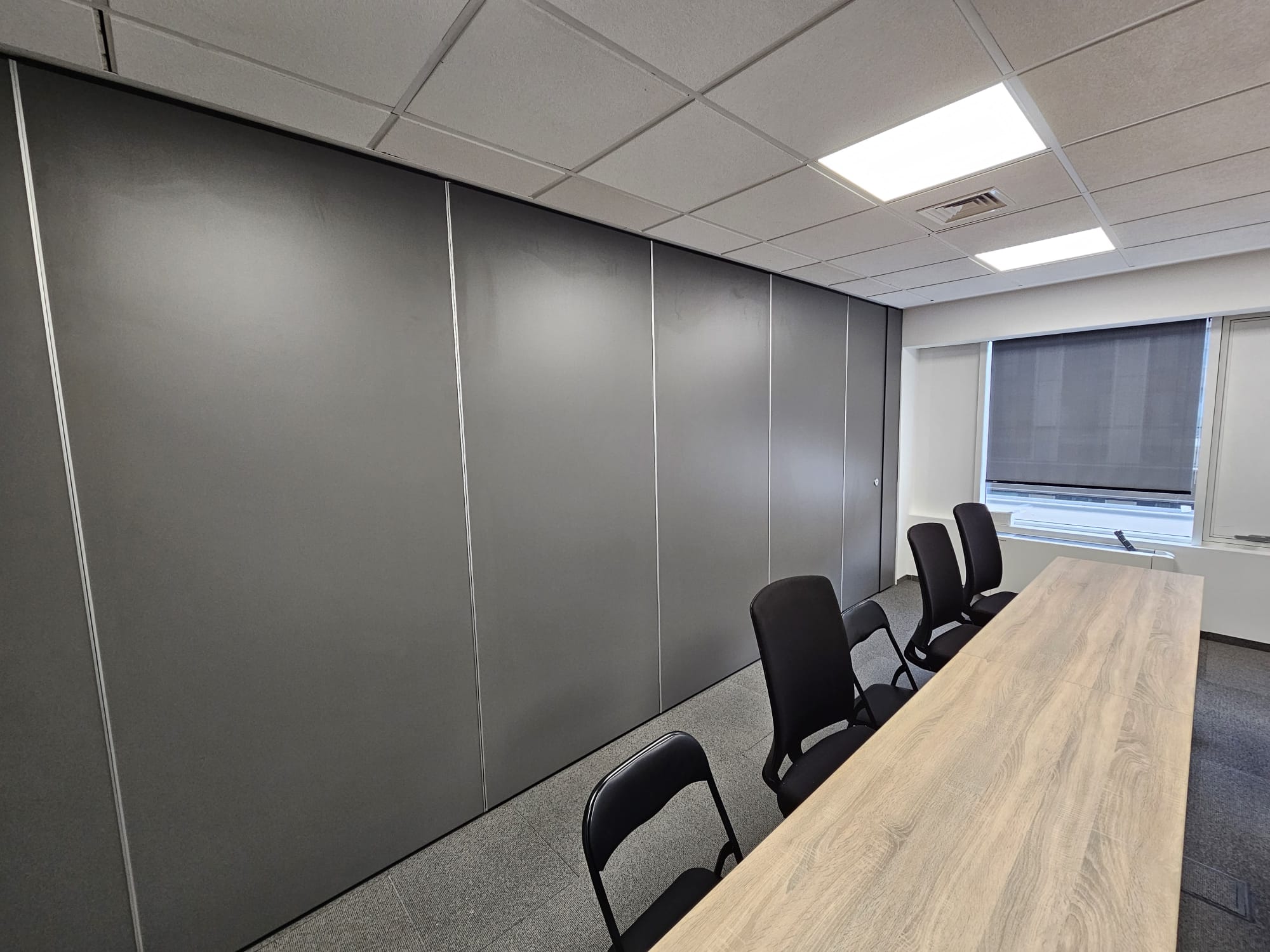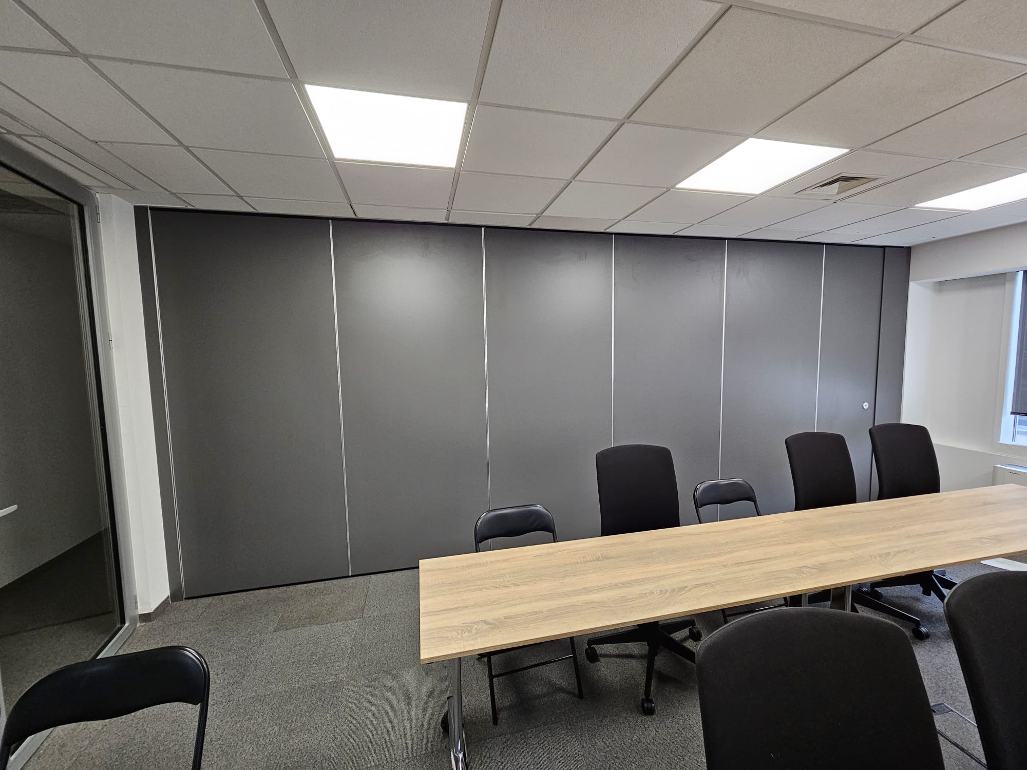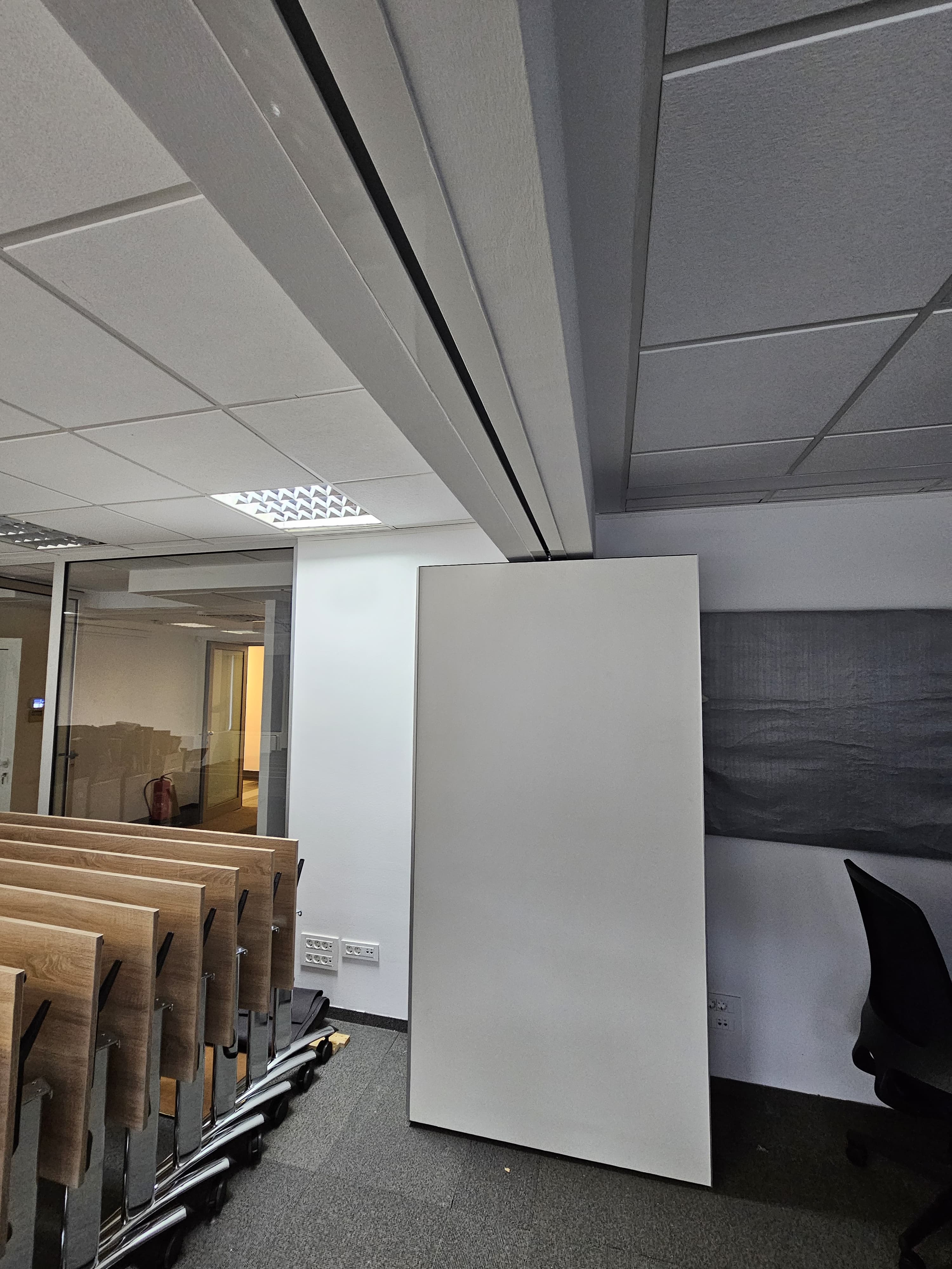 Given that the hall will be used for the purpose of education, organization of events and other business gatherings, partition walls are the optimal solution for quick and easy separation of space as needed. They are certified for Class 1 fire resistance and absorb sound of 36-44 dB. Of course, they are available in optional decors, and the specified panels are in the Onix gray decor.