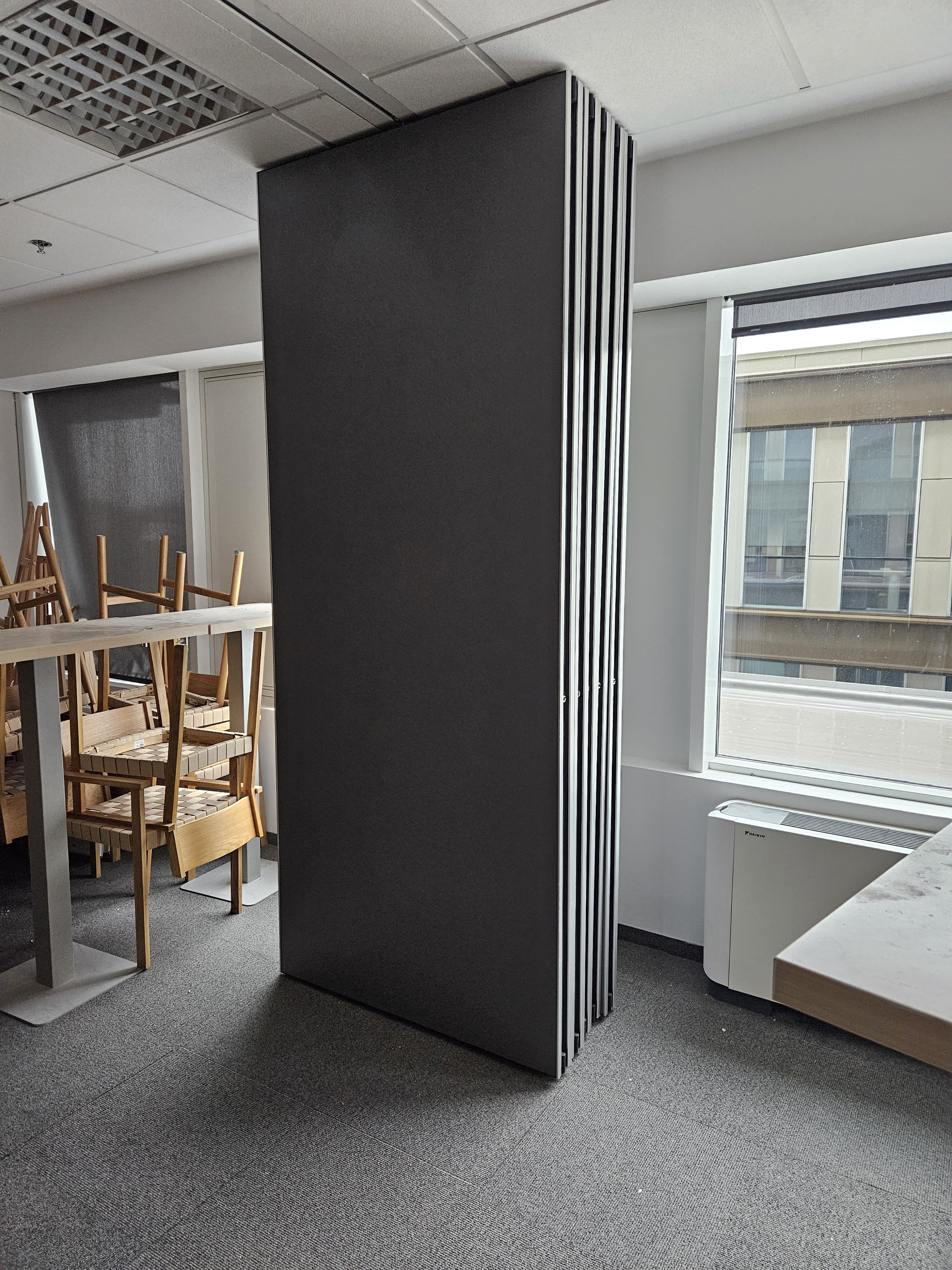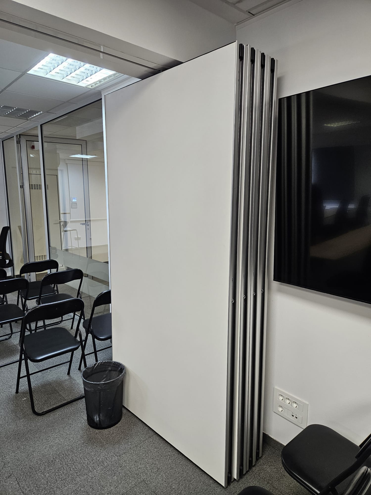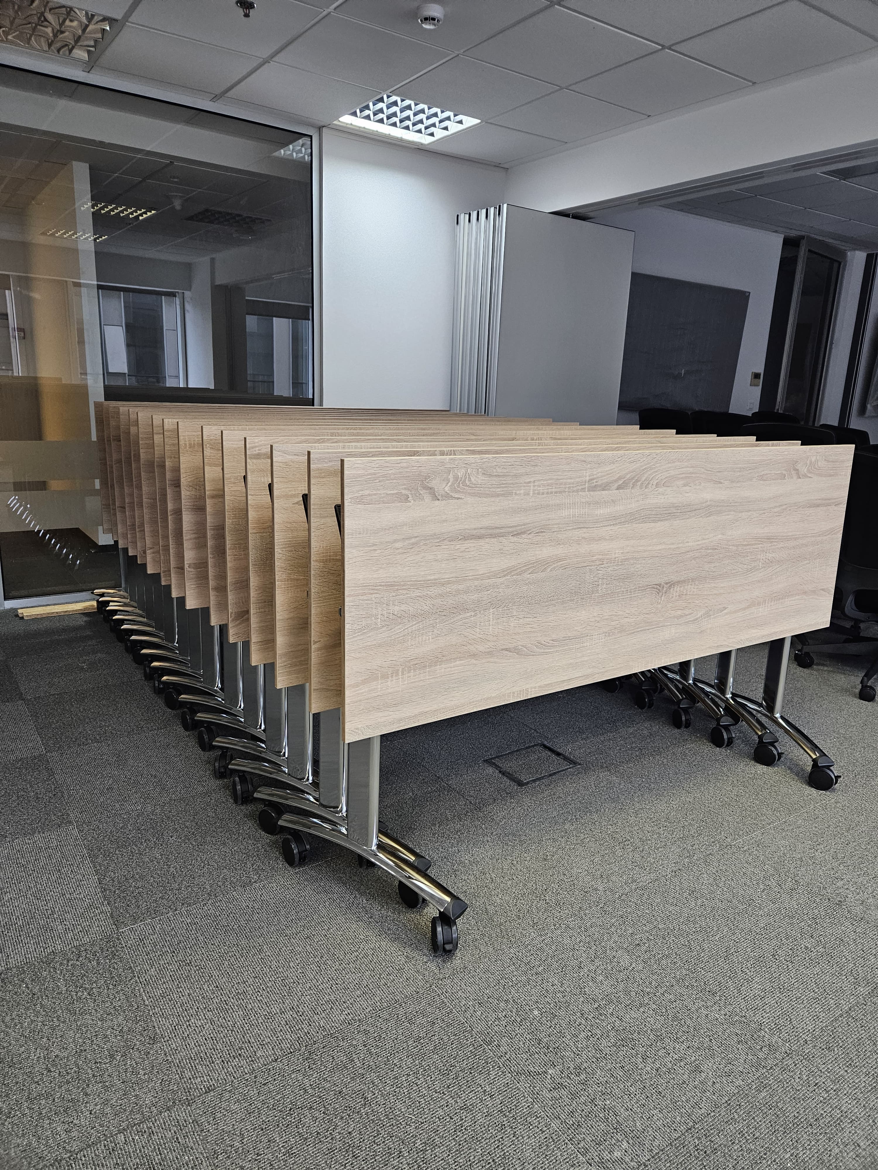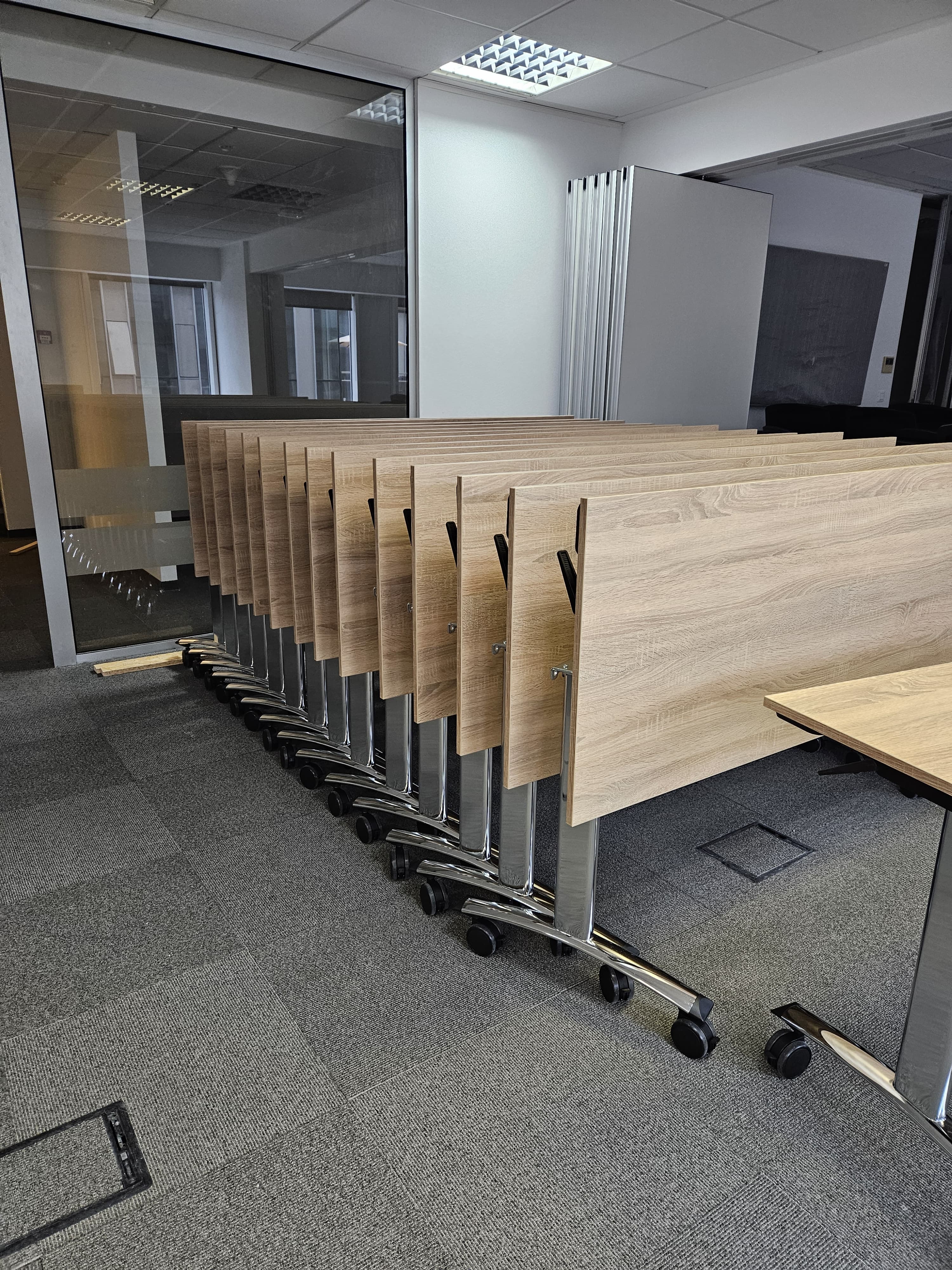 We enriched the newly opened multifunctional hall of the Danish giant Jysk with our most popular product - a folding Tipper table with a top in Noma oak decor and beautiful chrome legs. In addition to folding tables, we proudly present the latest product in our range - partition walls