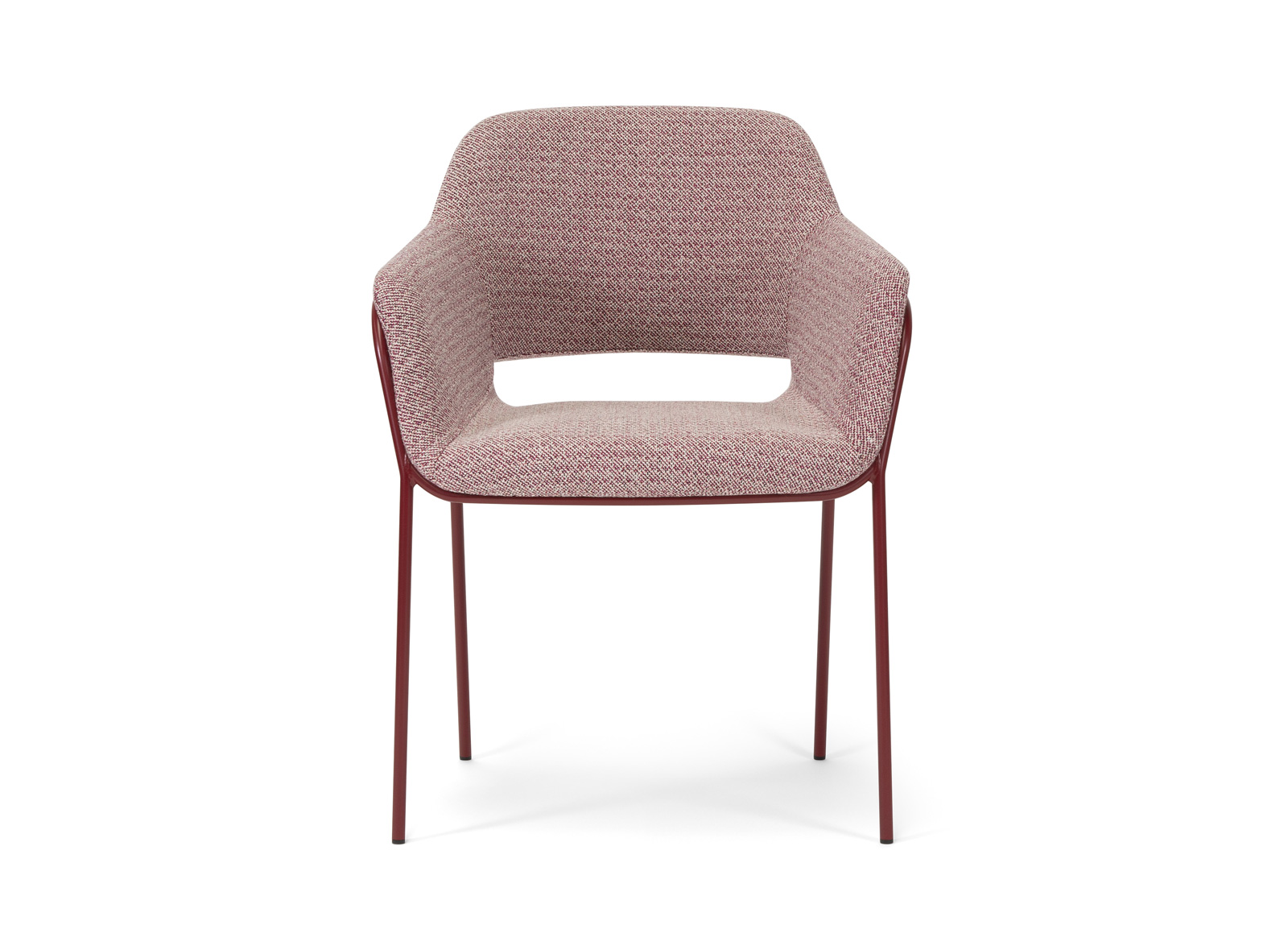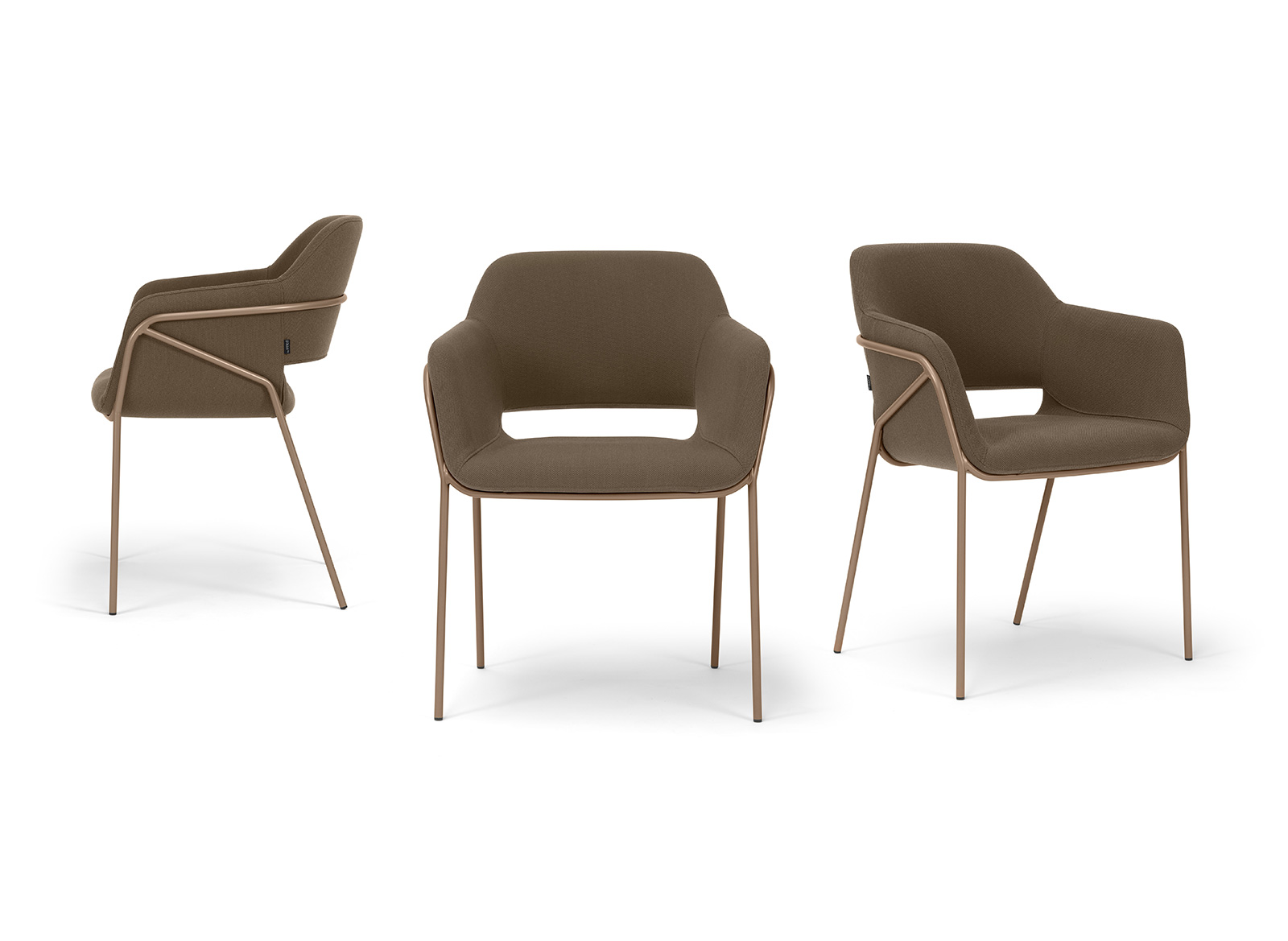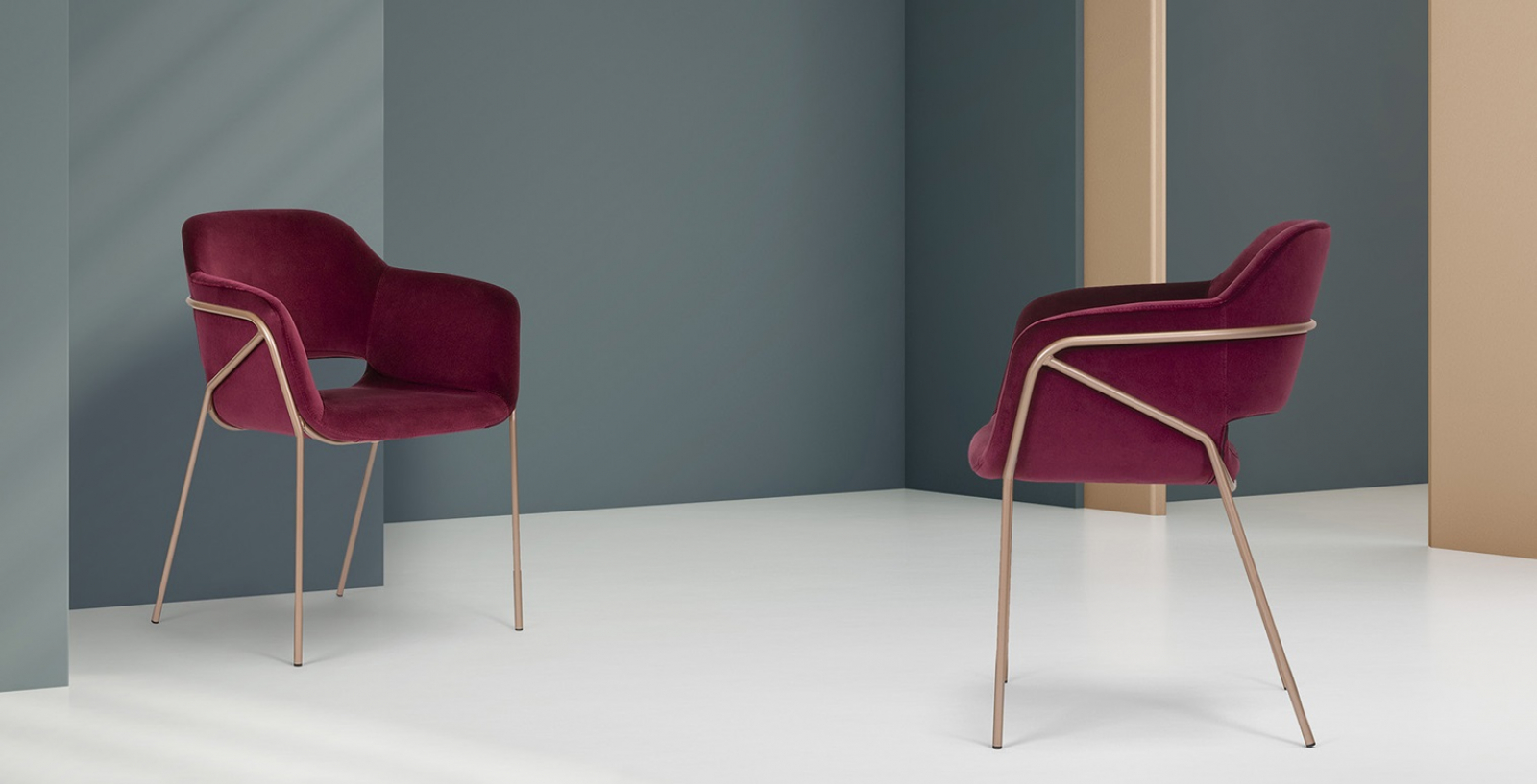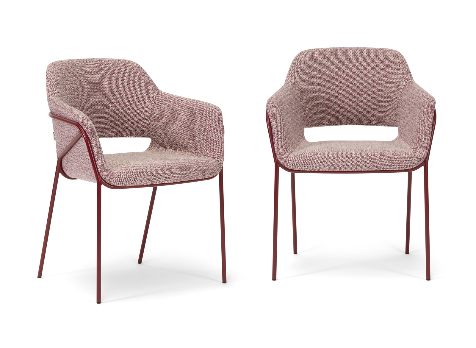 Magda is suitable for various environments, from the catering sector to public spaces and executive offices. It can be upholstered in a wide range of fabrics or leathers, and it is also possible to choose from many different colours of metal legs and frames, making it suitable for any interior and purpose.