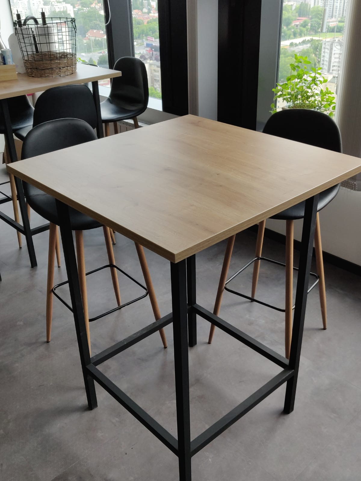 We "softened" the black metal base of the industrial design tables by combining it with the warm wood decor of natural oak.