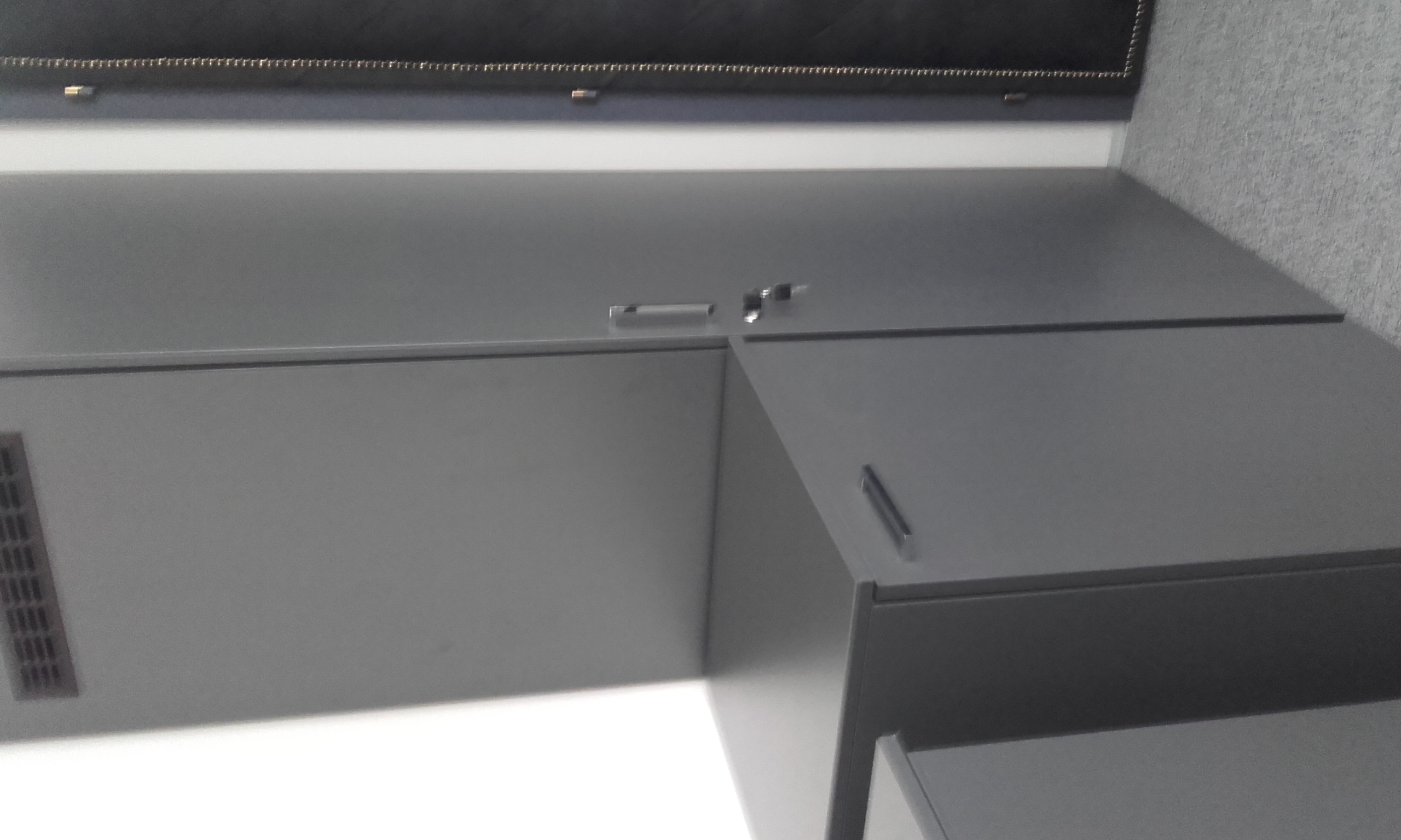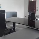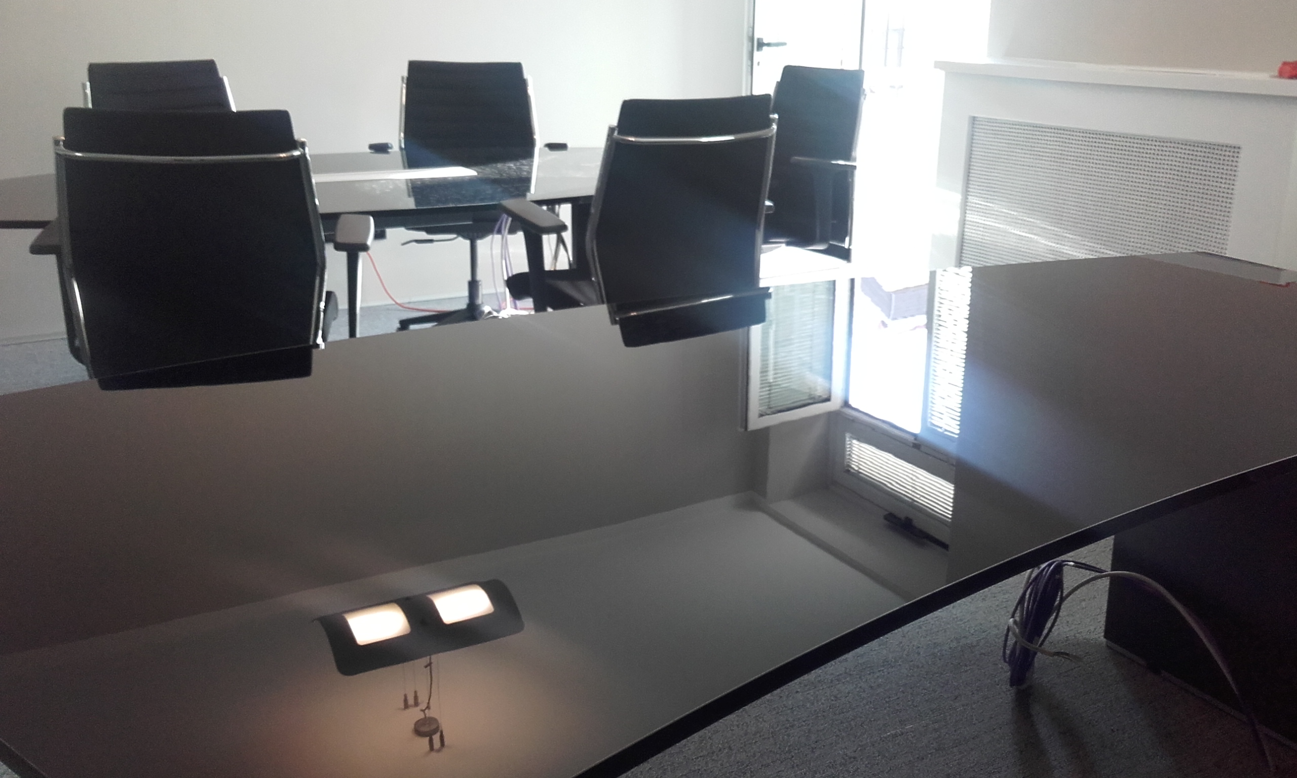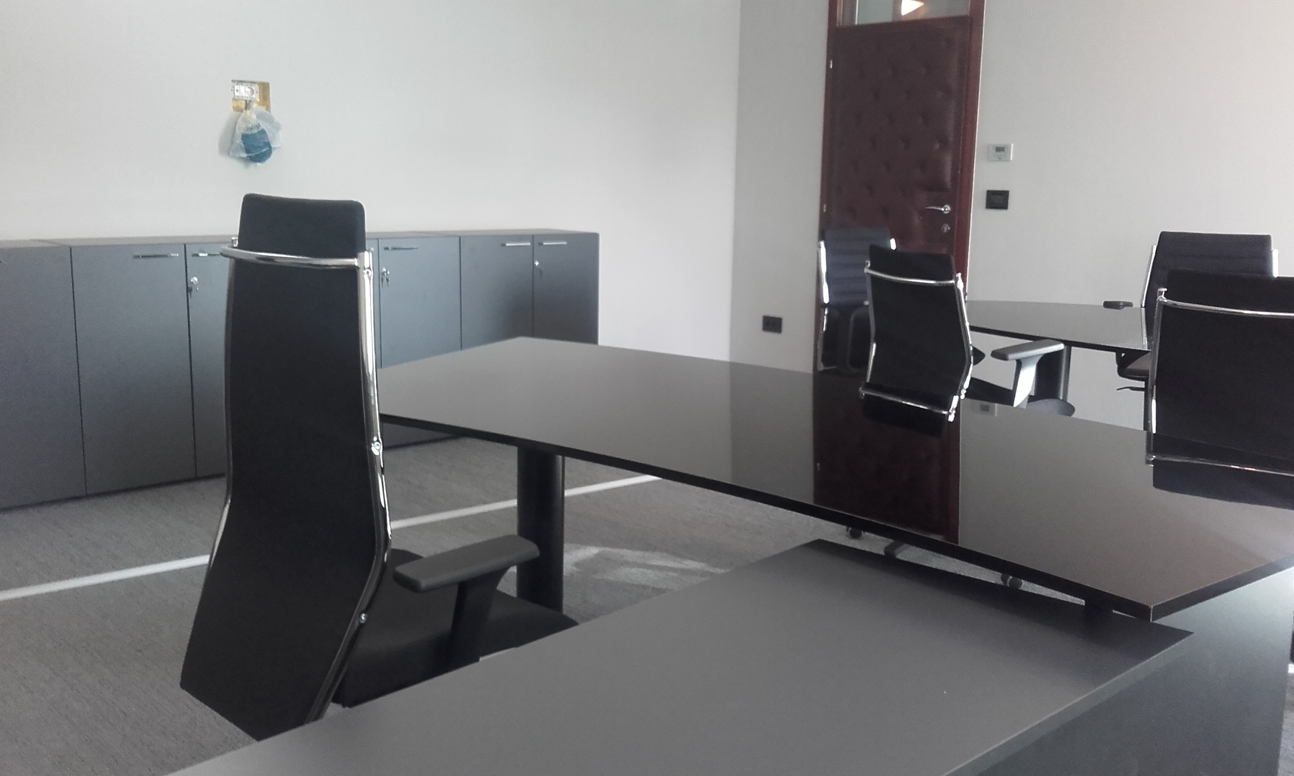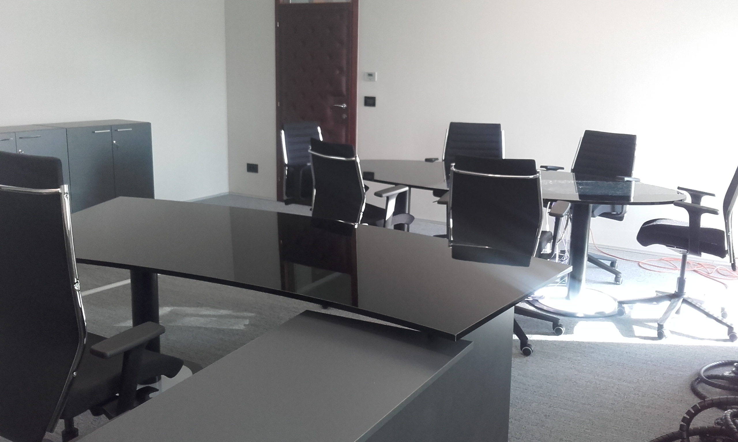A very sophisticated combination of black acrylic and anthracite particle board brought a touch of masculine elegance and distinctiveness to the offices.