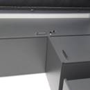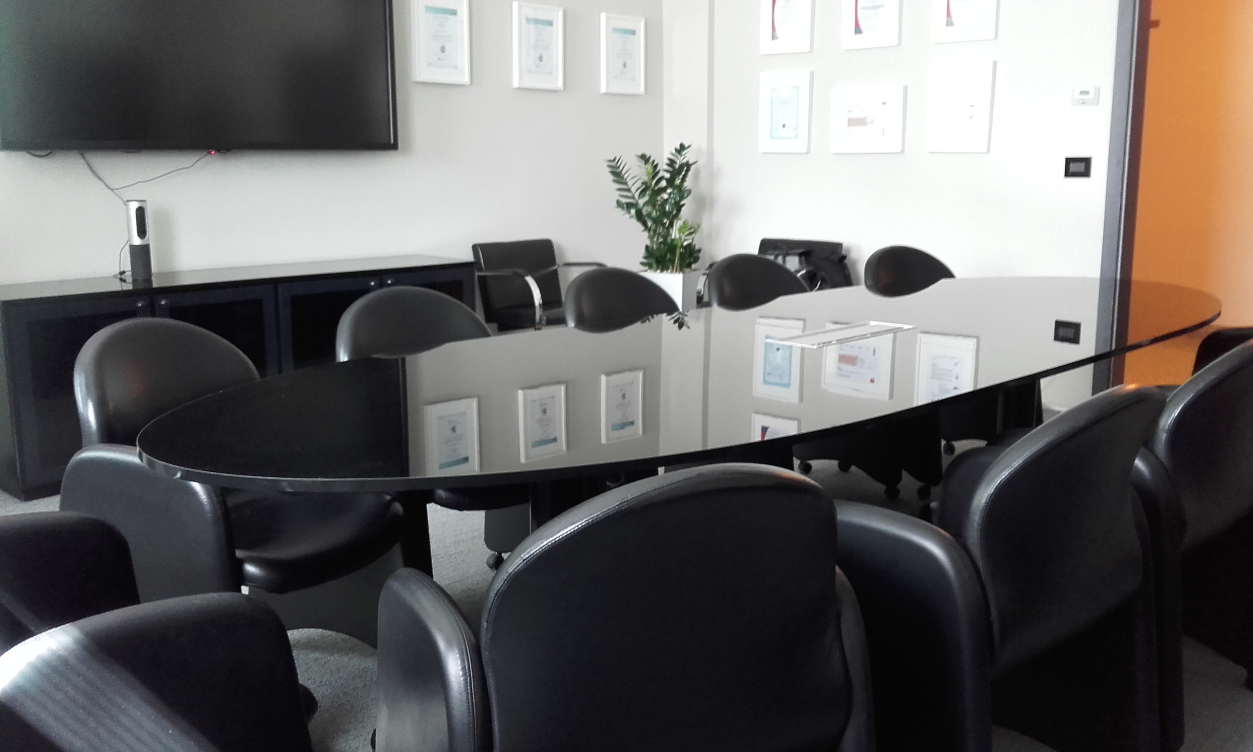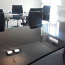 Conference tables have integrated cassettes with multimedia connectors (shuko, DWG, USB, internet and audio) whose cables are lowered through specially designed two-tone metal legs.