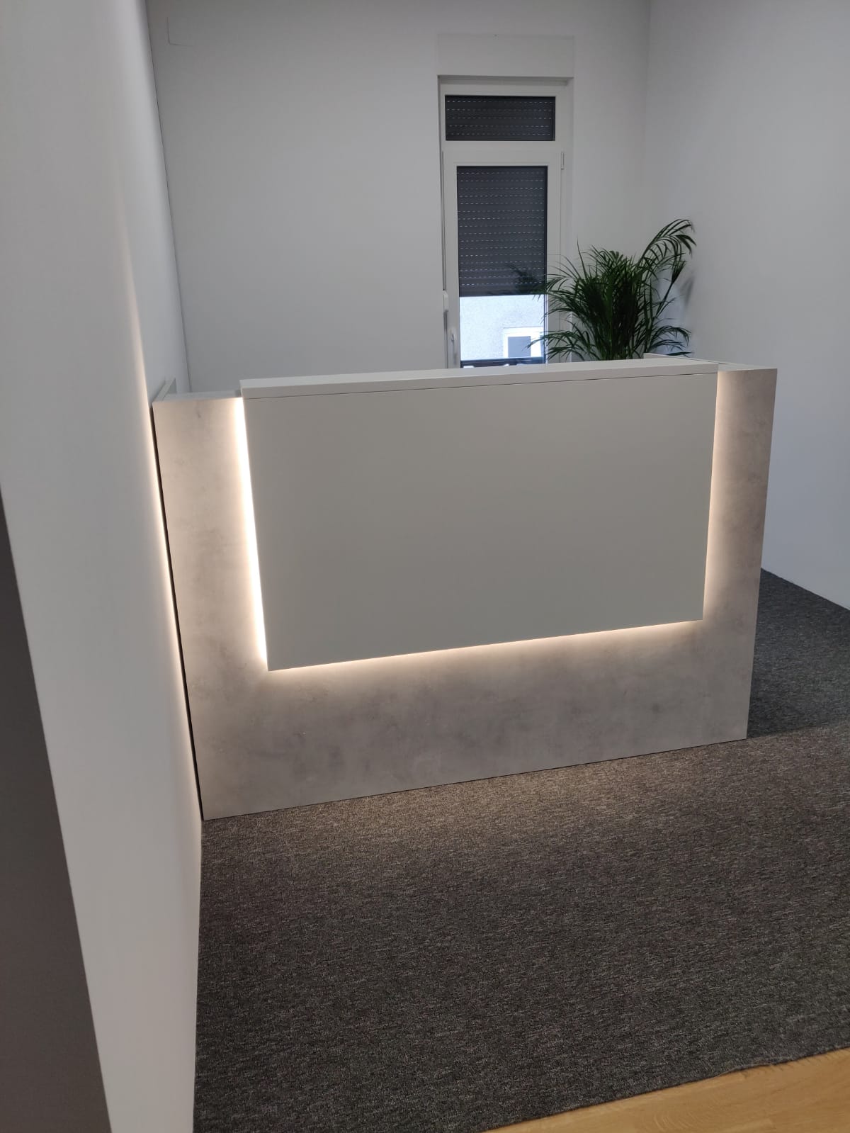 This time we combined the concrete decor as the basic decor, on which the white decorative mask with built-in LED lighting fitted perfectly.