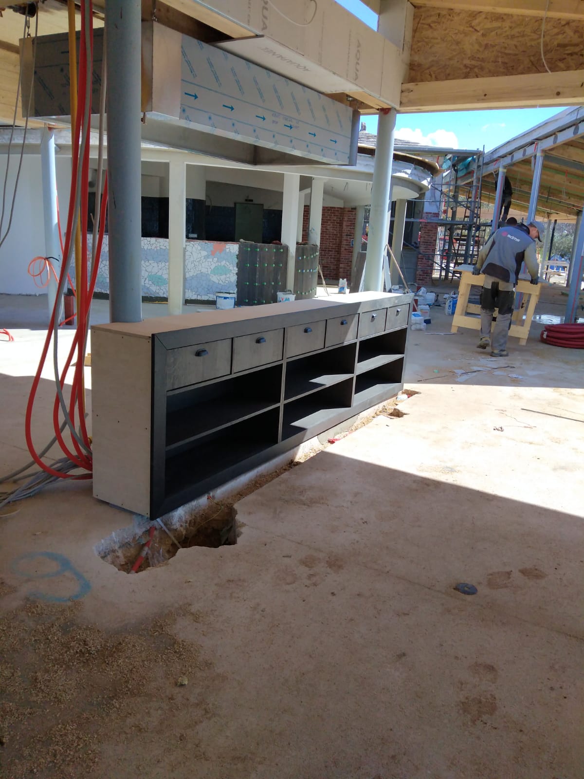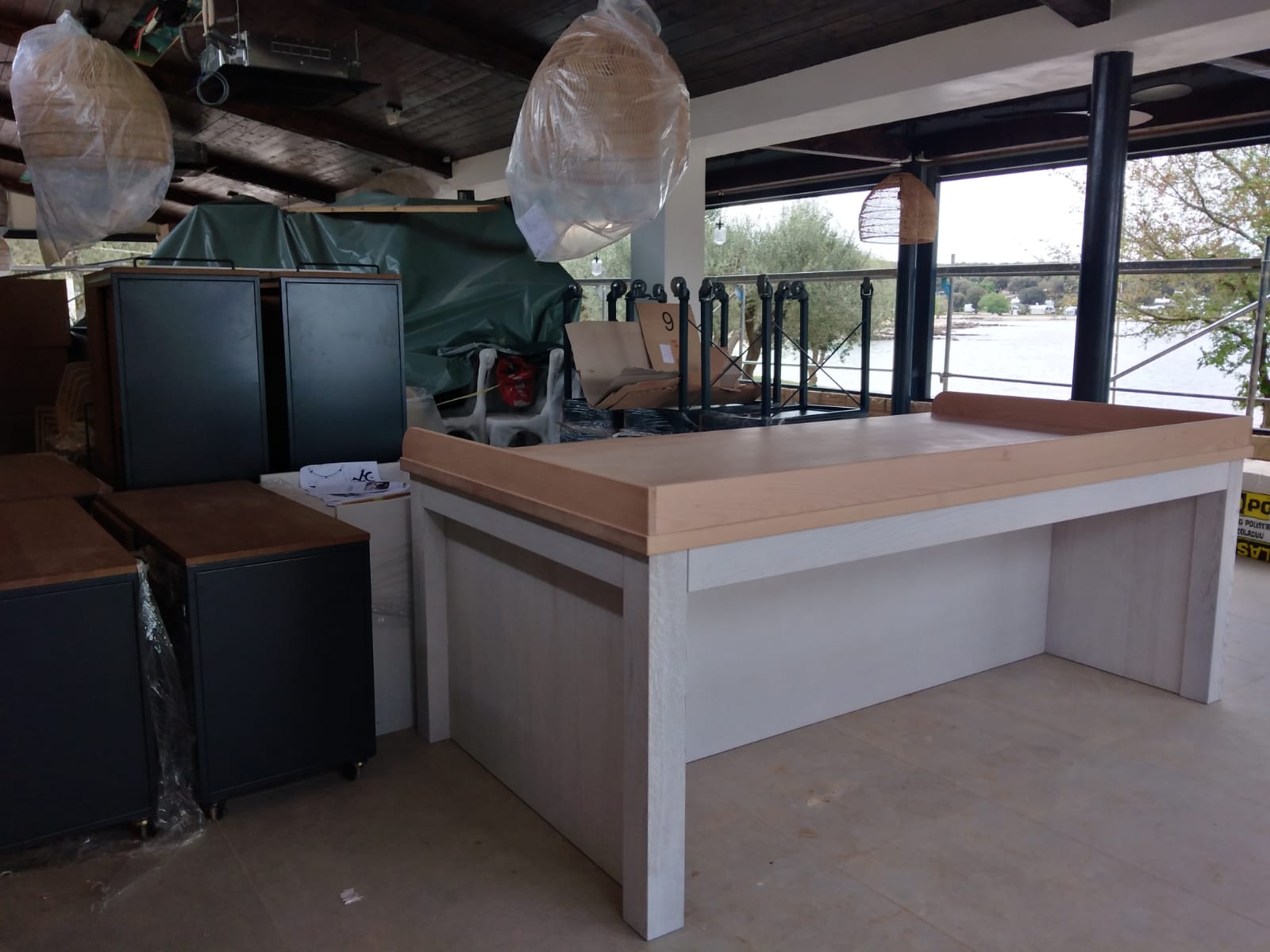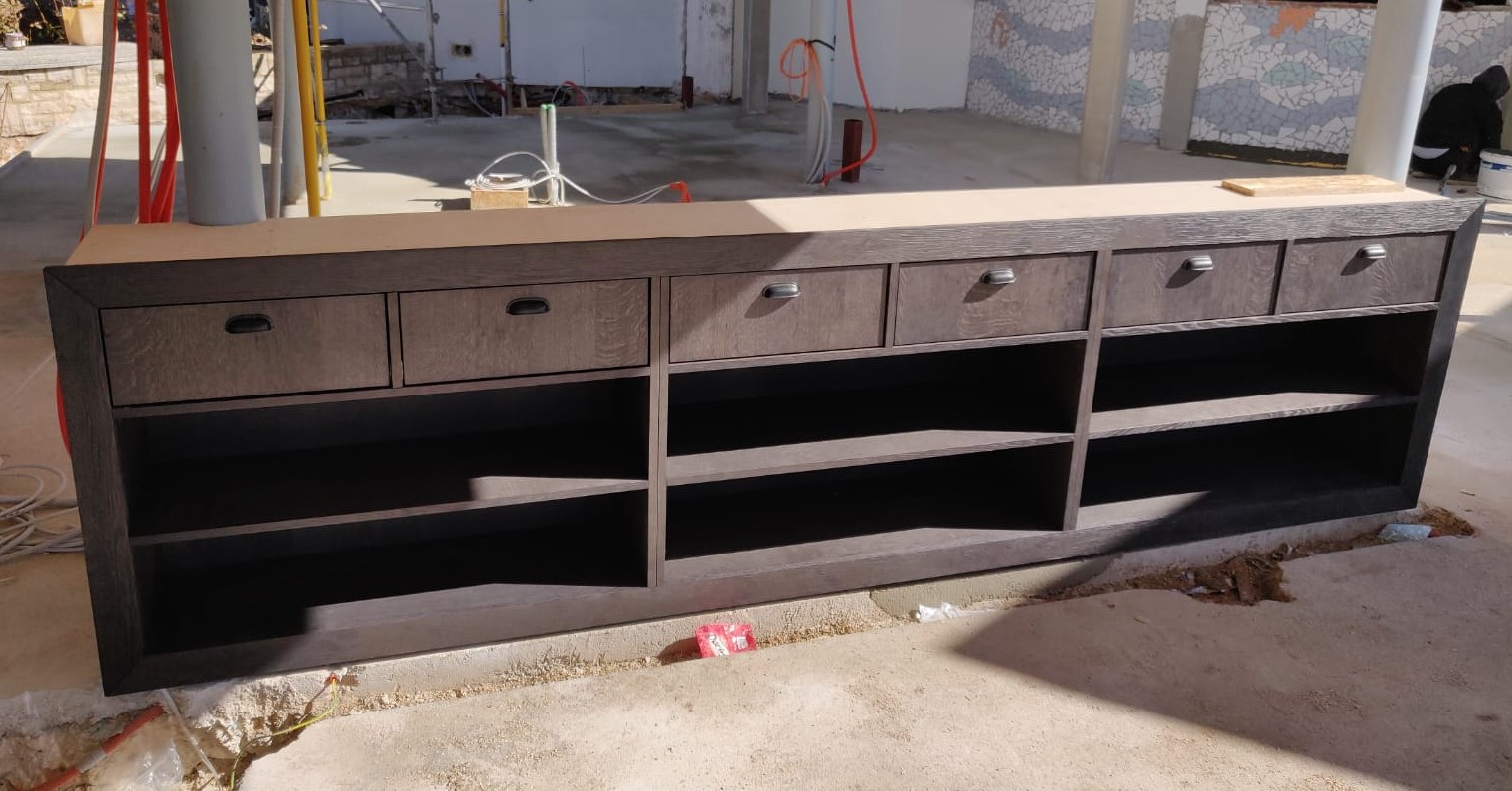 Our task was to design and make unique pieces of furniture: a large table with a composite panel with a diameter of 180 cm and a wire base, oak wine racks, a long show cooking chest of drawers, a large pasta table, service cabinets on wheels with sliding doors and drawers, MDF lining around the aisle, metal stands for pots, shelves, signalization, etc.