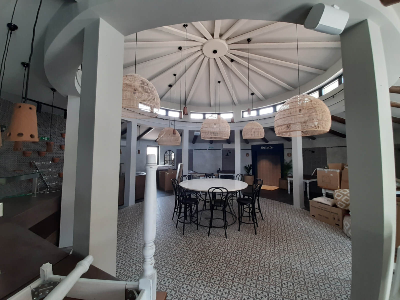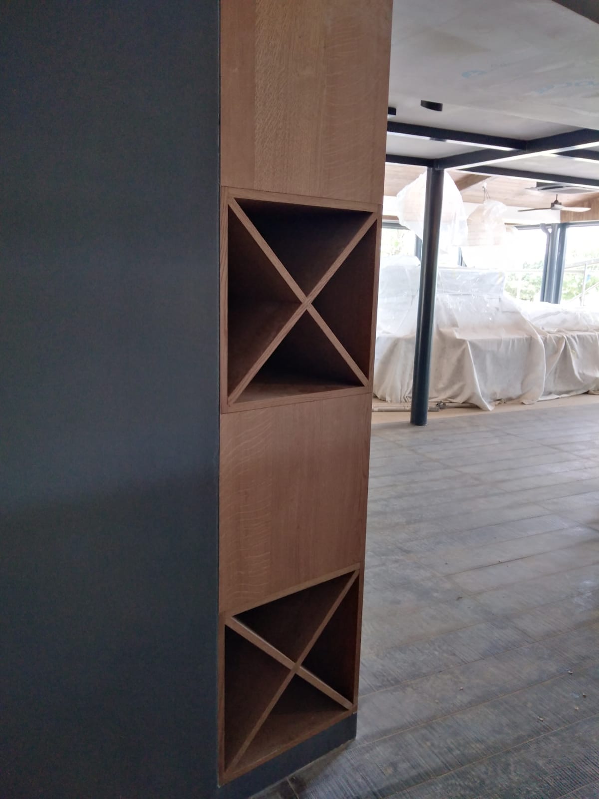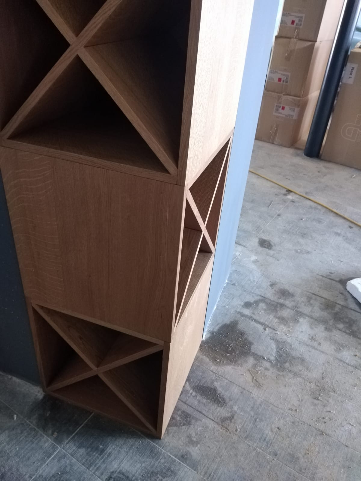 Our task was to design and make unique pieces of furniture: a large table with a composite panel with a diameter of 180 cm and a wire base, oak wine racks, a long show cooking chest of drawers, a large pasta table, service cabinets on wheels with sliding doors and drawers, MDF lining around the aisle, metal stands for pots, shelves, signalization, etc.