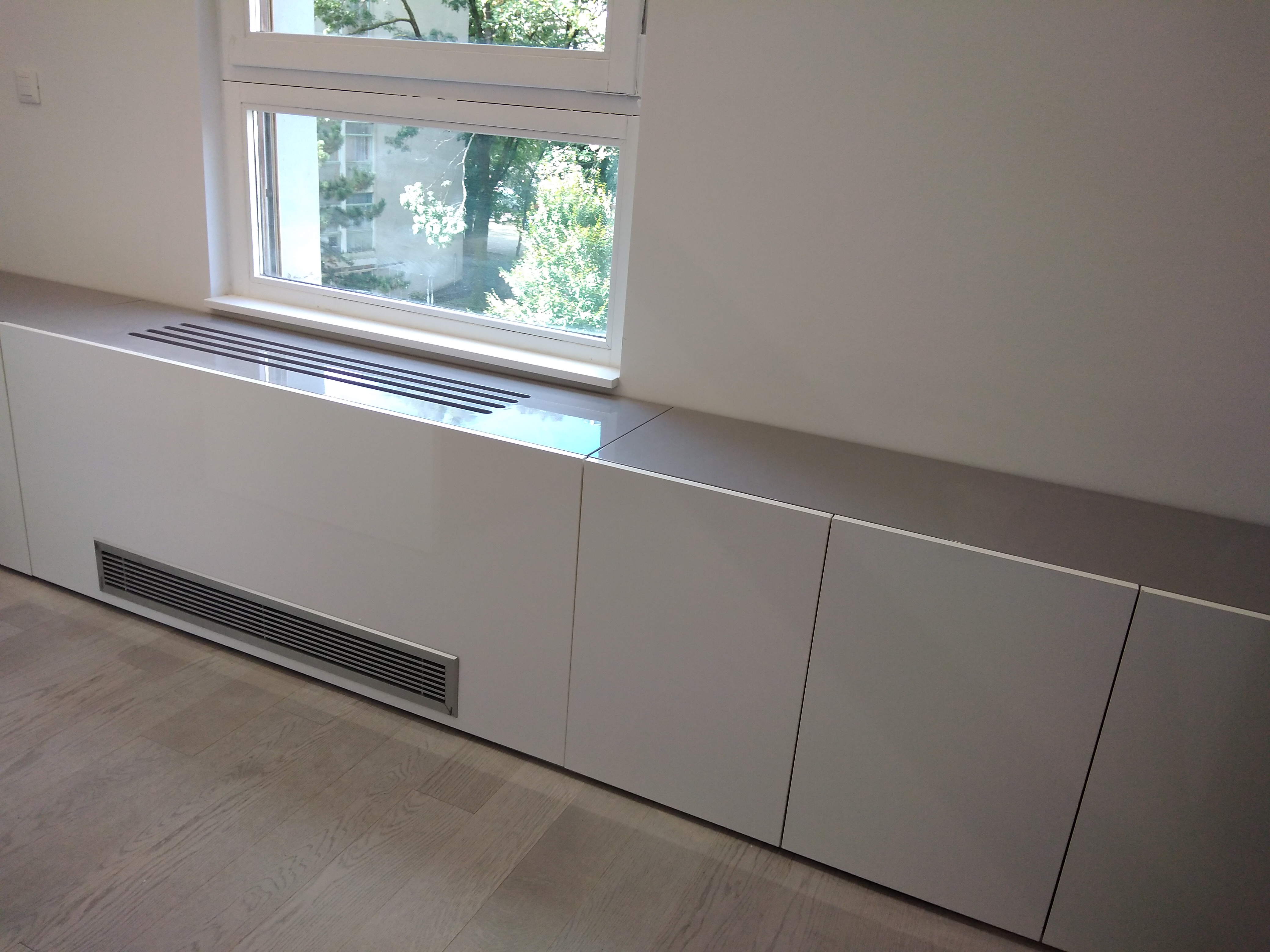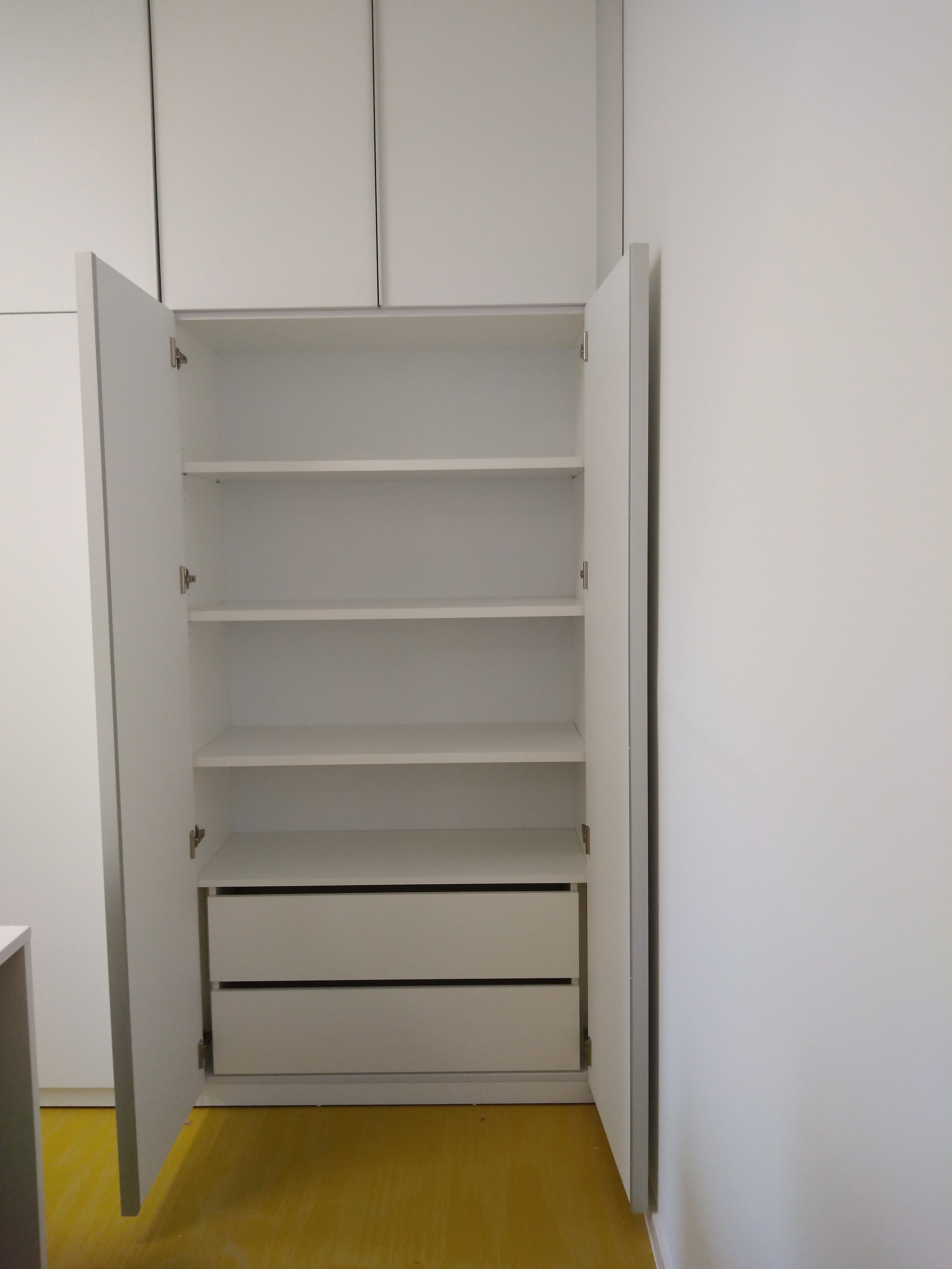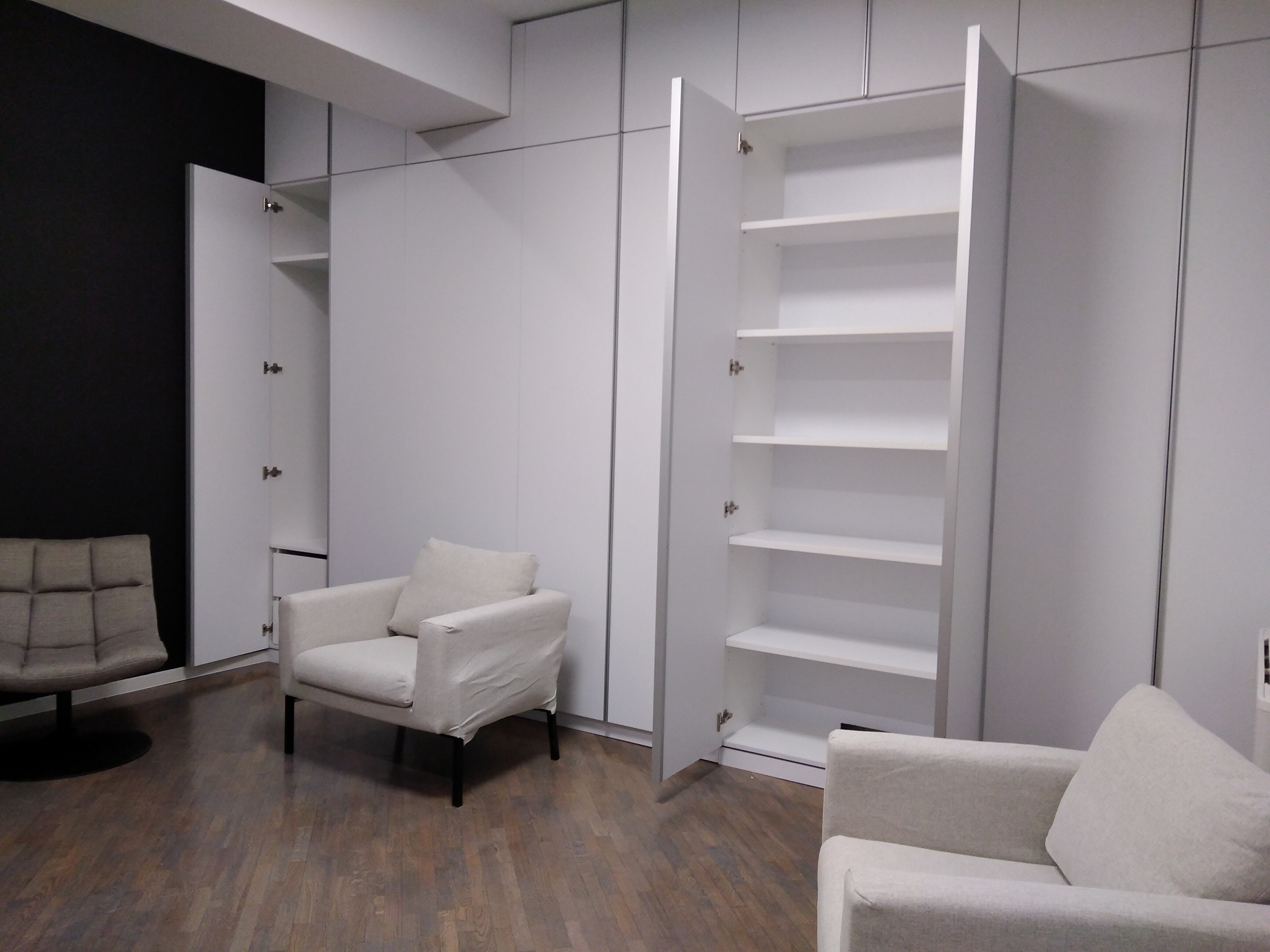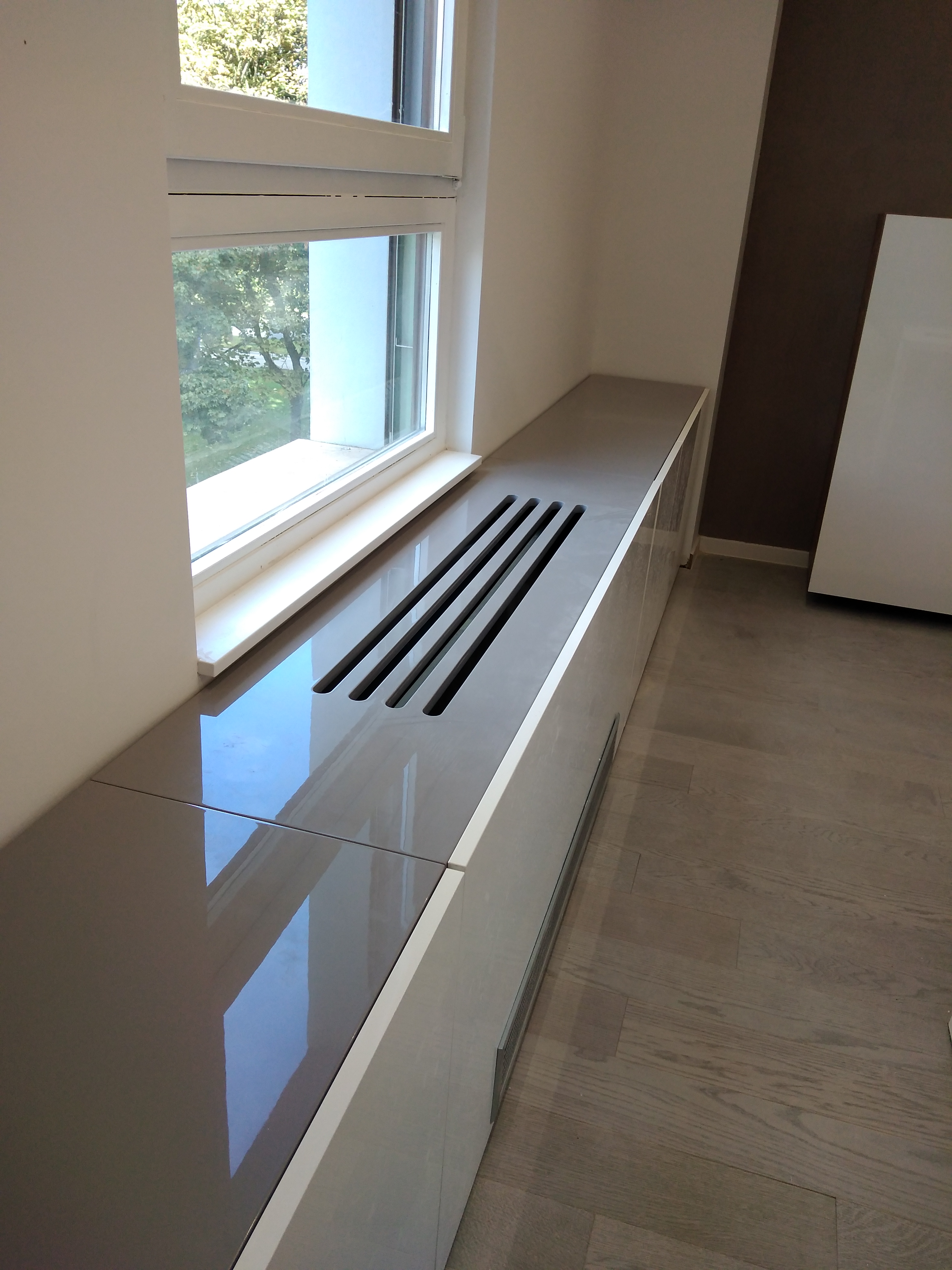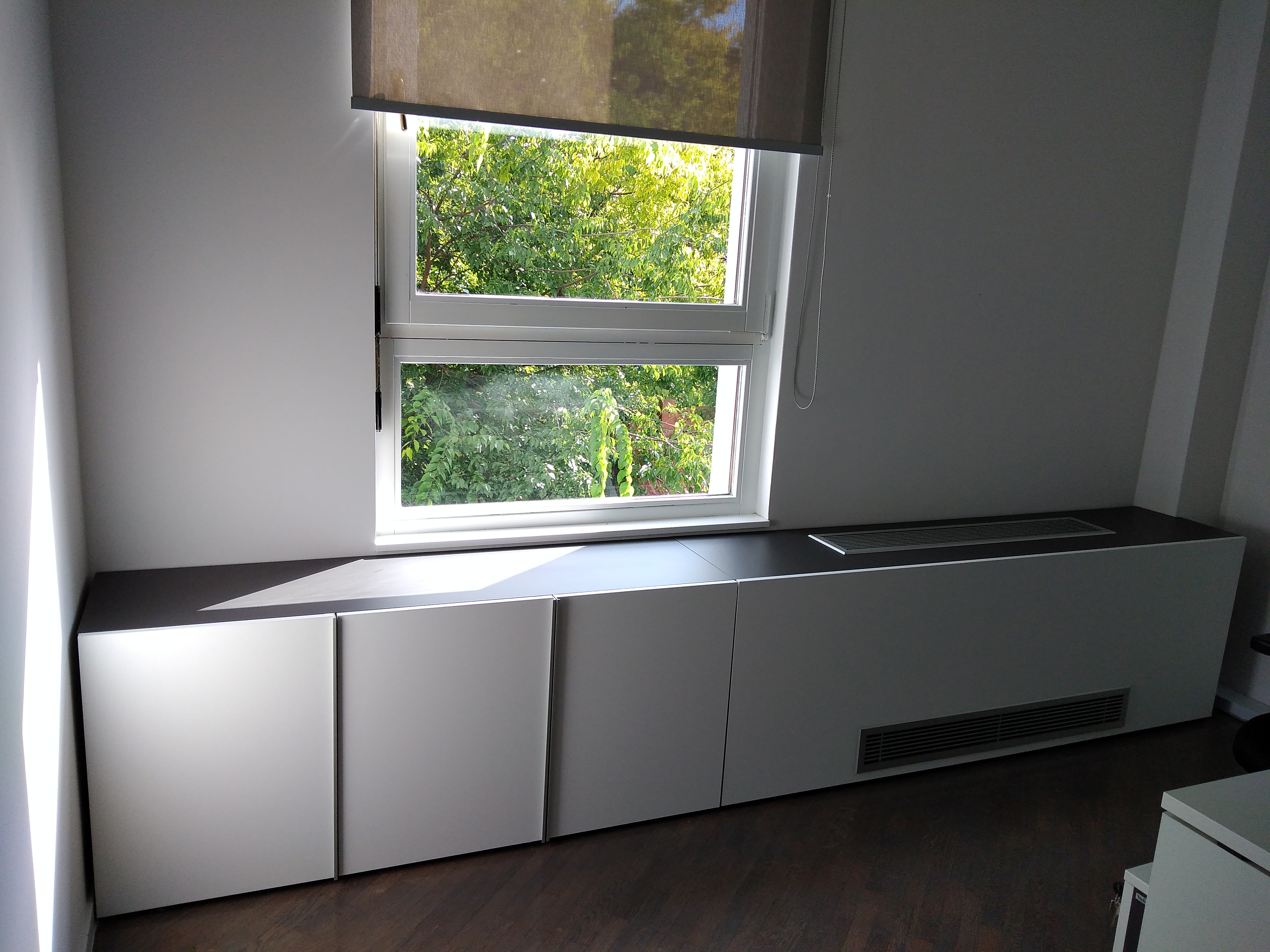 The furniture was made according to the architect's project and included worktops, built-in cabinets, electrical cabinet coverings, wall coverings and fan coil device coverings, cabinets...
