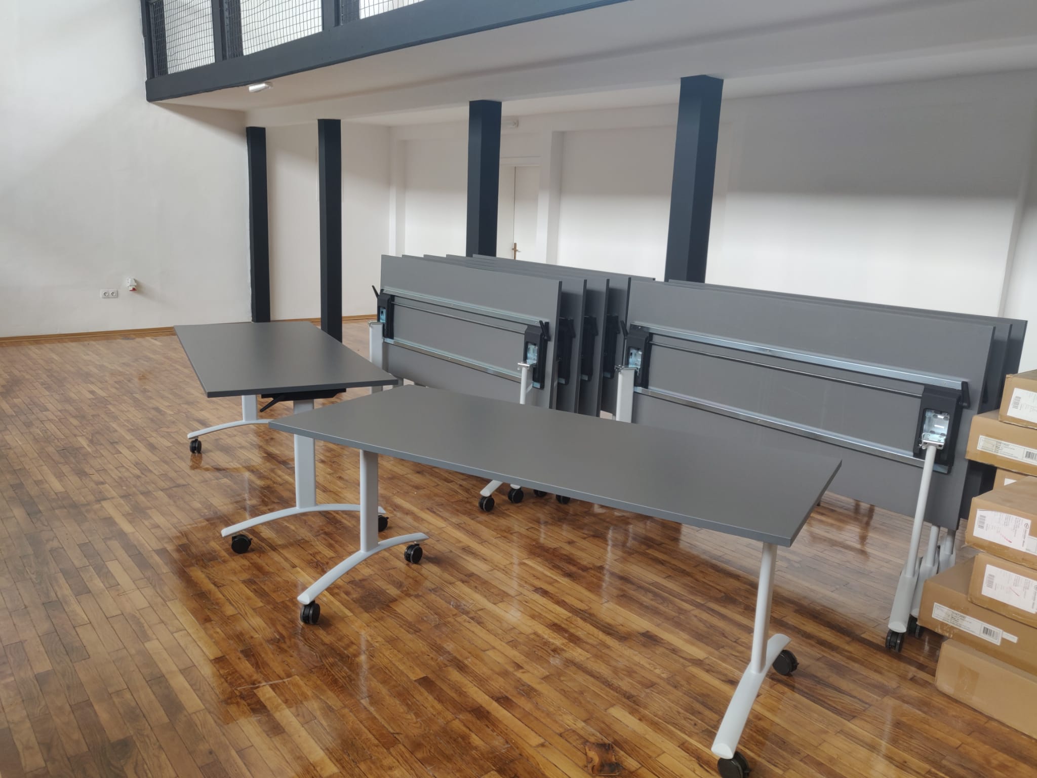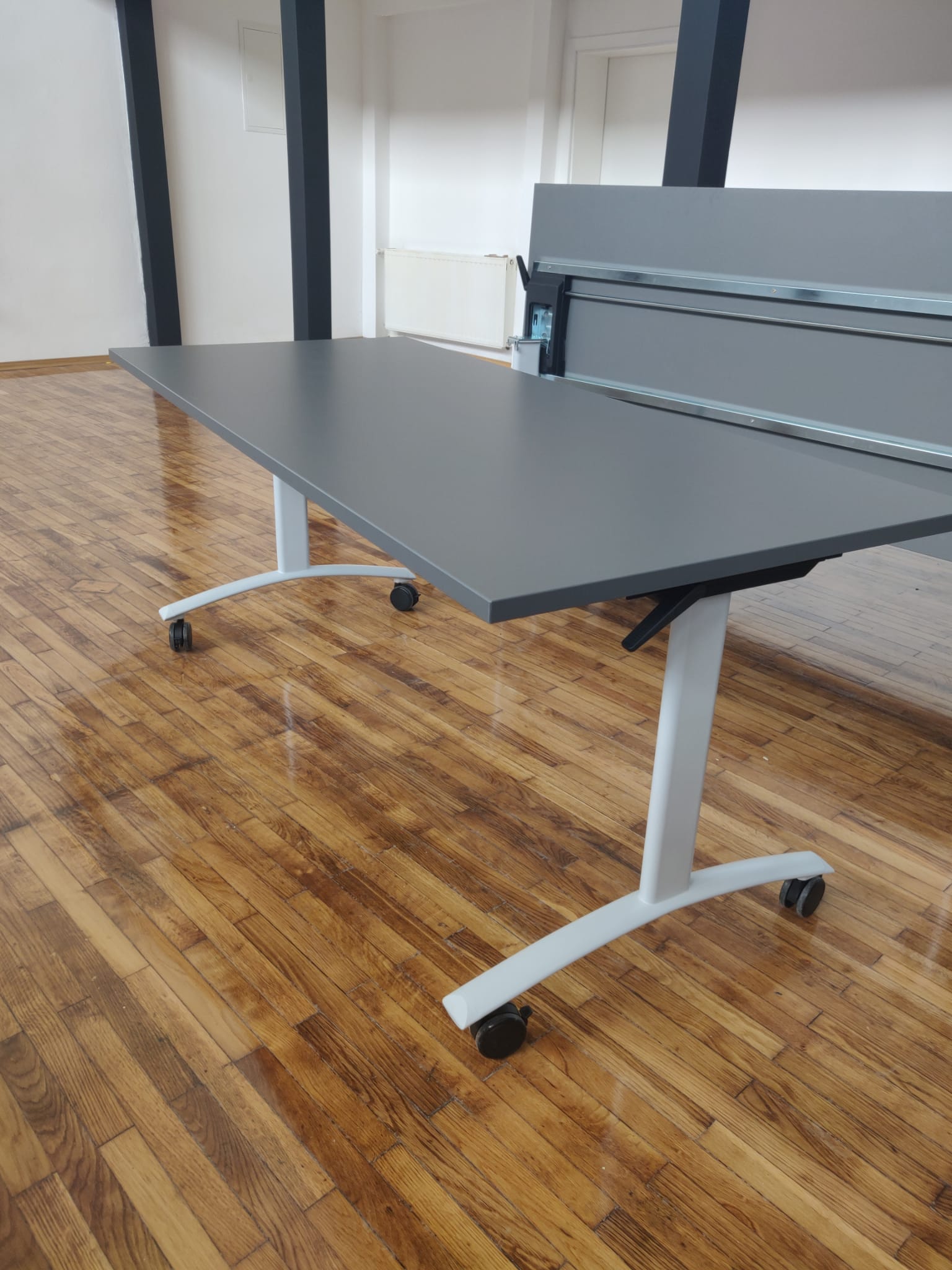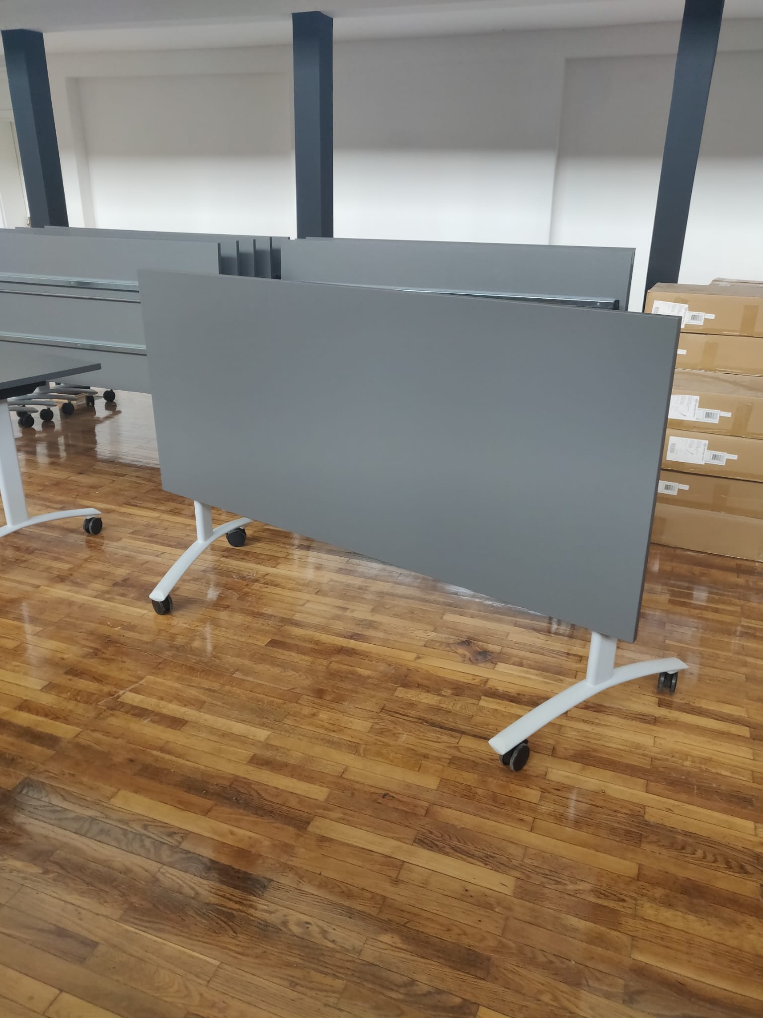 The dimensions of the supplied tables are 180x80, with anthracite gray panels and a light gray metal base.