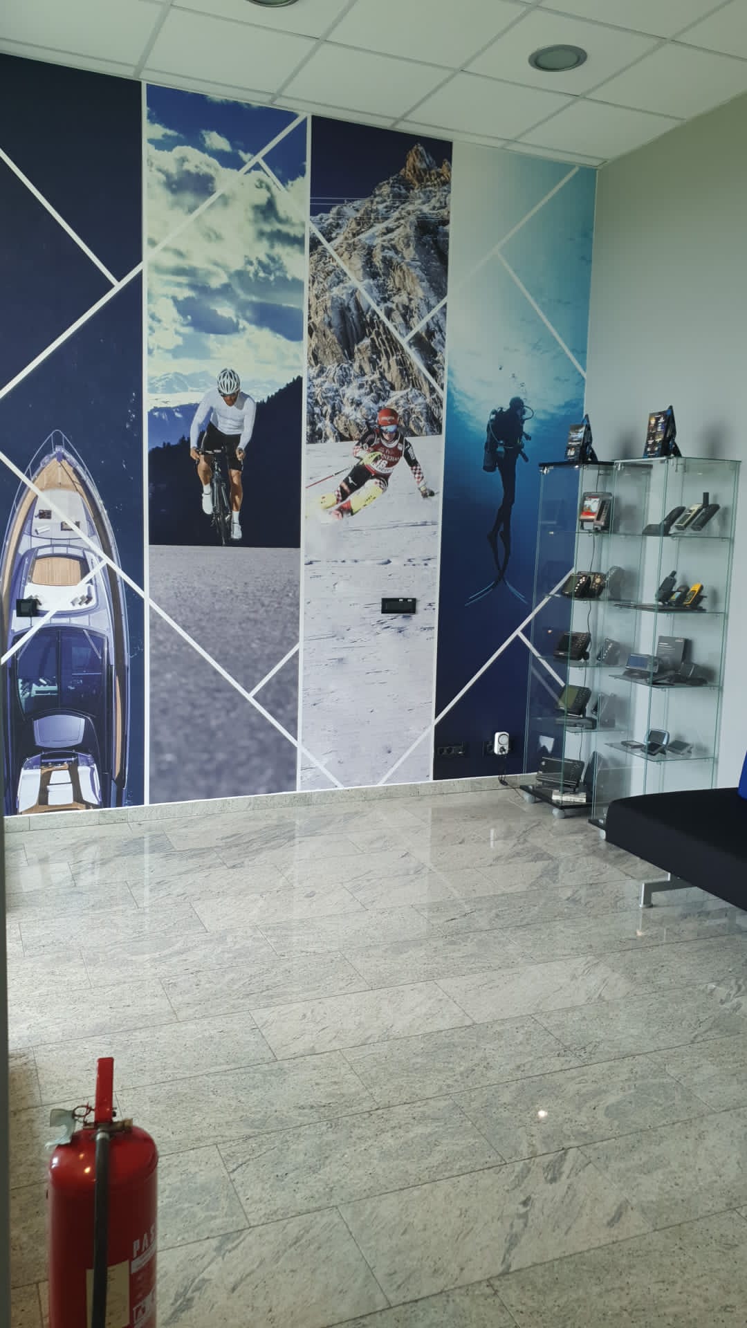 Na drugom zidu smo se odlučili za foto tapetu velikih dimenzija, s posebno biranim slikama koje predstavljaju karakter firme, dinamiku, avanturu i sport.