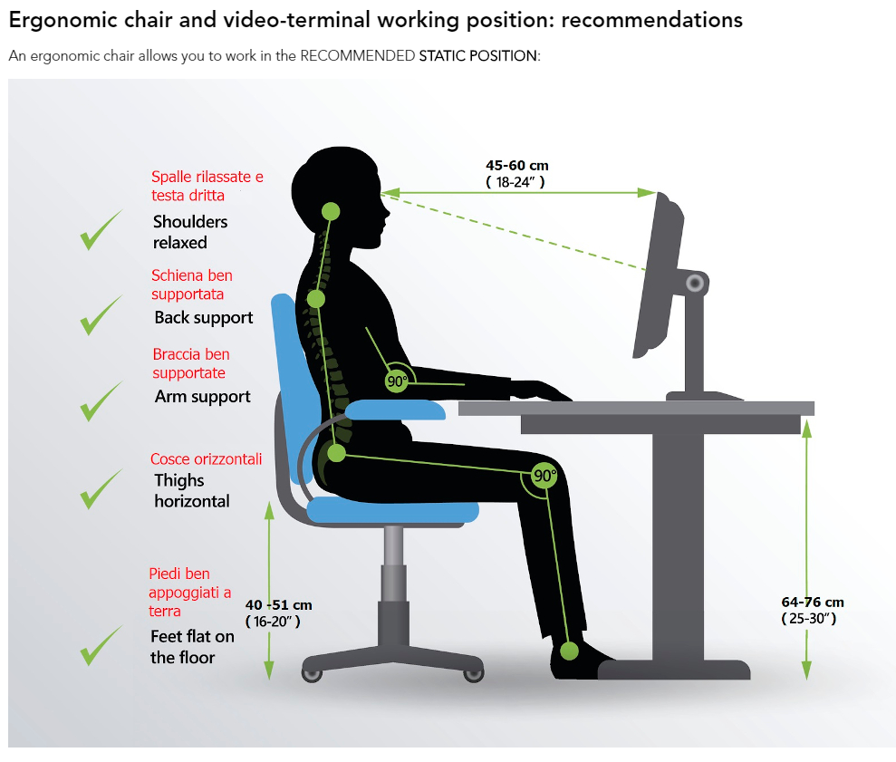 Zdravo radno mjesto uključuje niz elemenata: od udobne radne stolice koja vam mora pružiti dobru potporu za ruke i leđa i mora biti prilagođena vašoj ergonomiji, preko radnog stola prikladne visine i površine, kvalitetnih monitora i računala koja ne proizvode buku, do redovnog provjetravanja, prikladne osvjetljenost prostora itd.