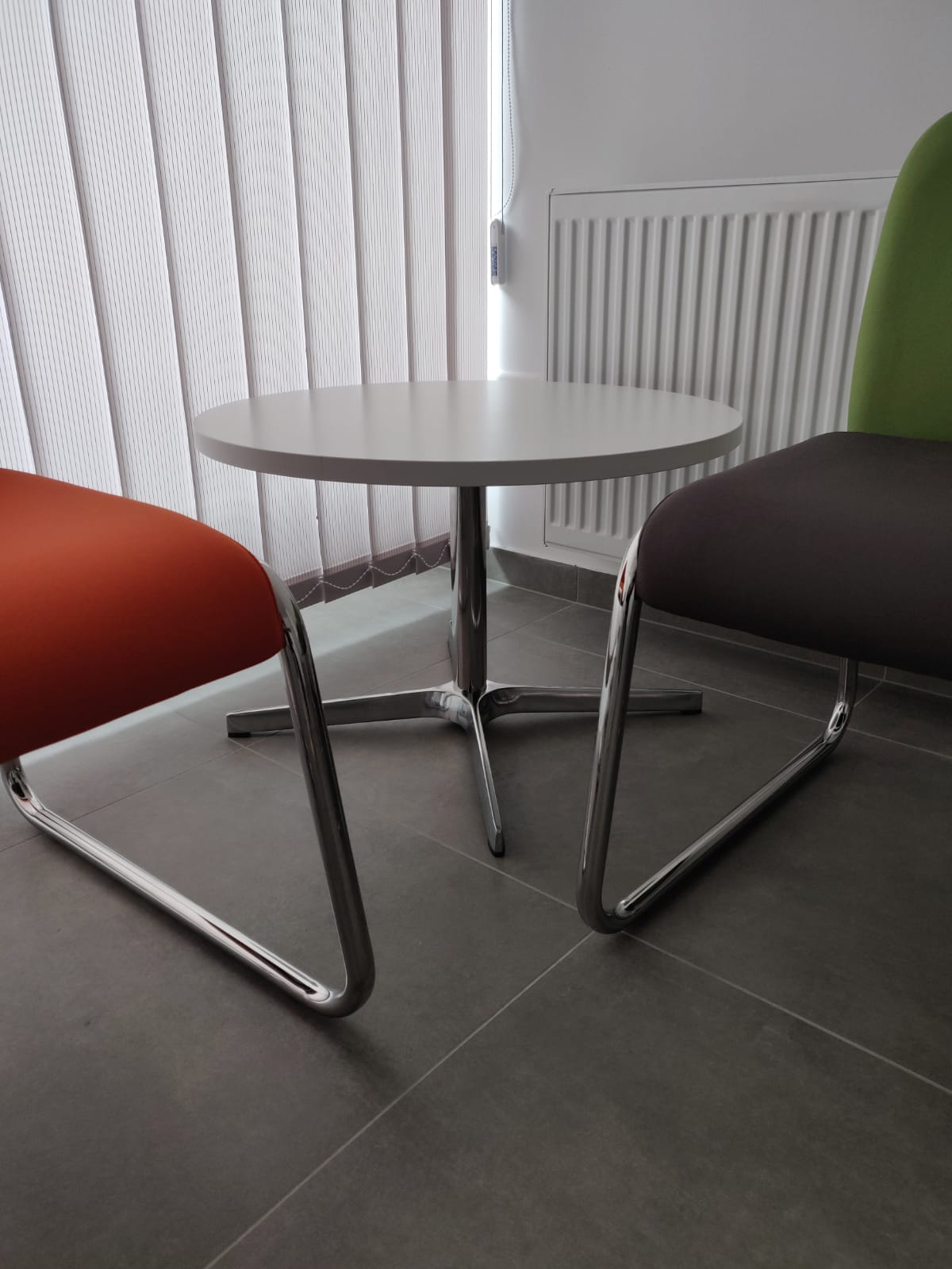 Fotelje smo upotpunili elegantnim bijelim klub stolićem promjera70cm na aluminijskoj bazi.
