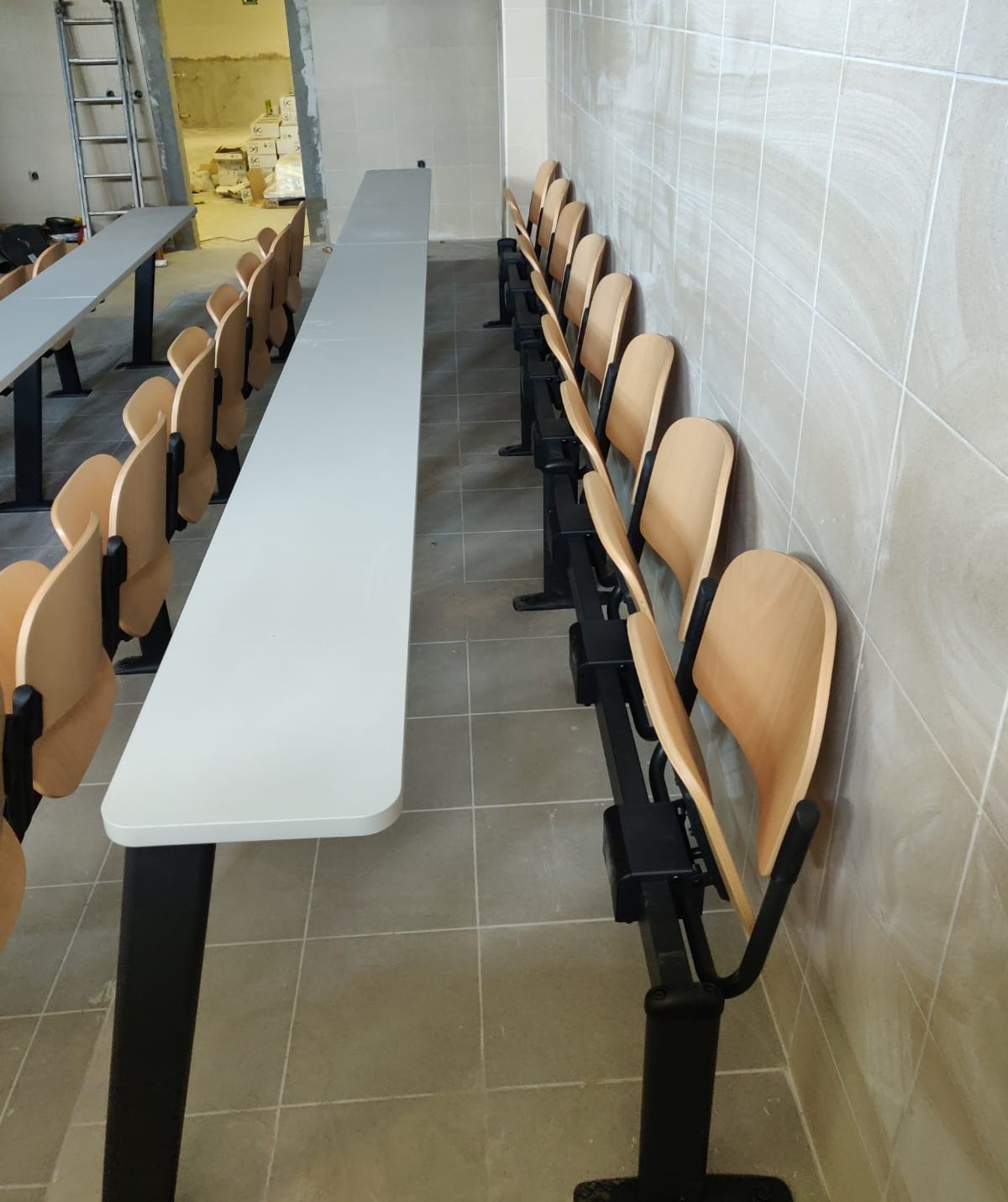 U ovom projektu, stolice su na jednoj gredi, a ploče za pisanje posebno fiksirane na vlastitoj konstrukciji.