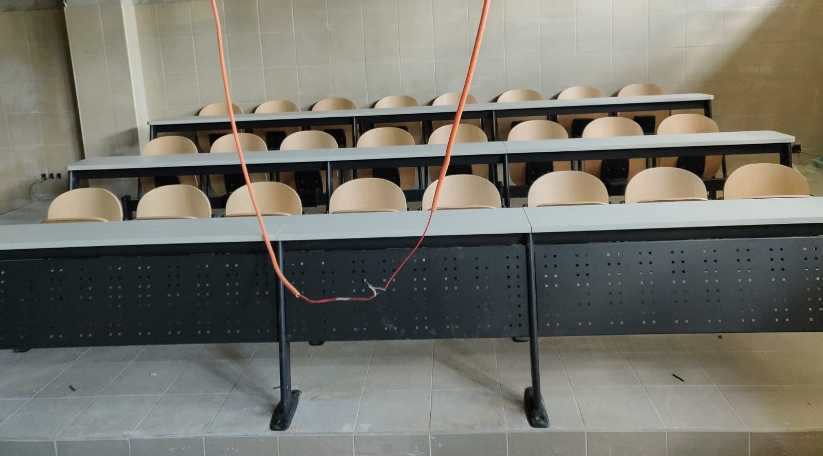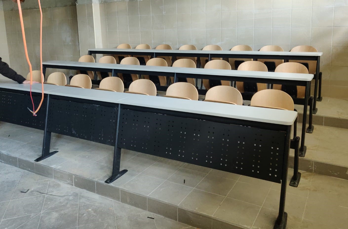 Prema projektnom zadatku, učionica ove srednje škole dobila je tri reda preklopnih stolica na gredi s pripadajućim stolovima za pisanje.